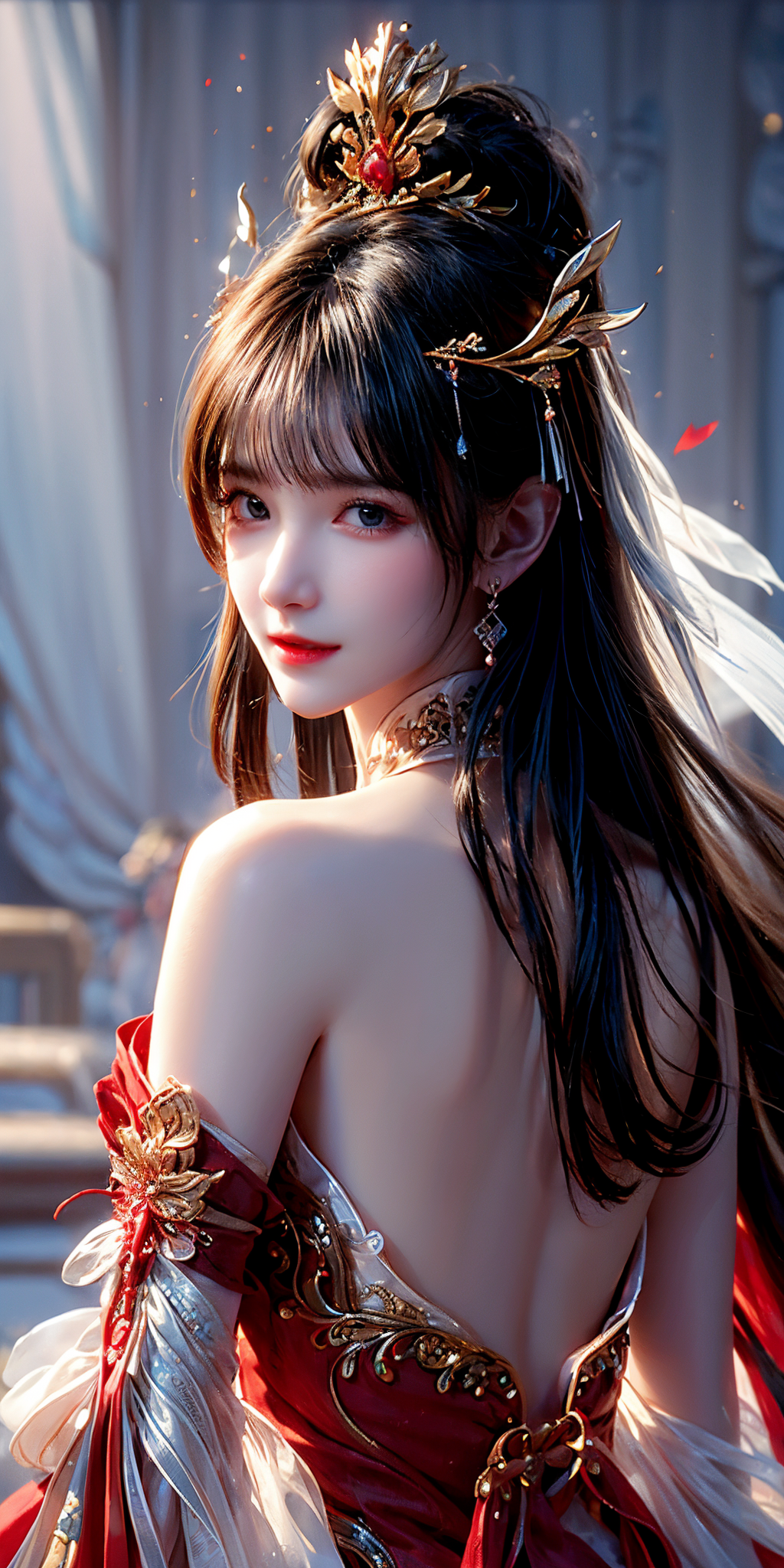 ((close-up)),best quality, masterpiece, high resolution, CG, 1 girl, long black hair, red dress, water, solo, jewelry, earrings, hair accessory, splash, upper body, bag, brunette, lighting, frankness, Photos, high resolution, 4k, 8k, bokeh, wearing red wedding dress, Chinese wedding dress, hanfu, phoenix crown, sitting position, blonde crown,