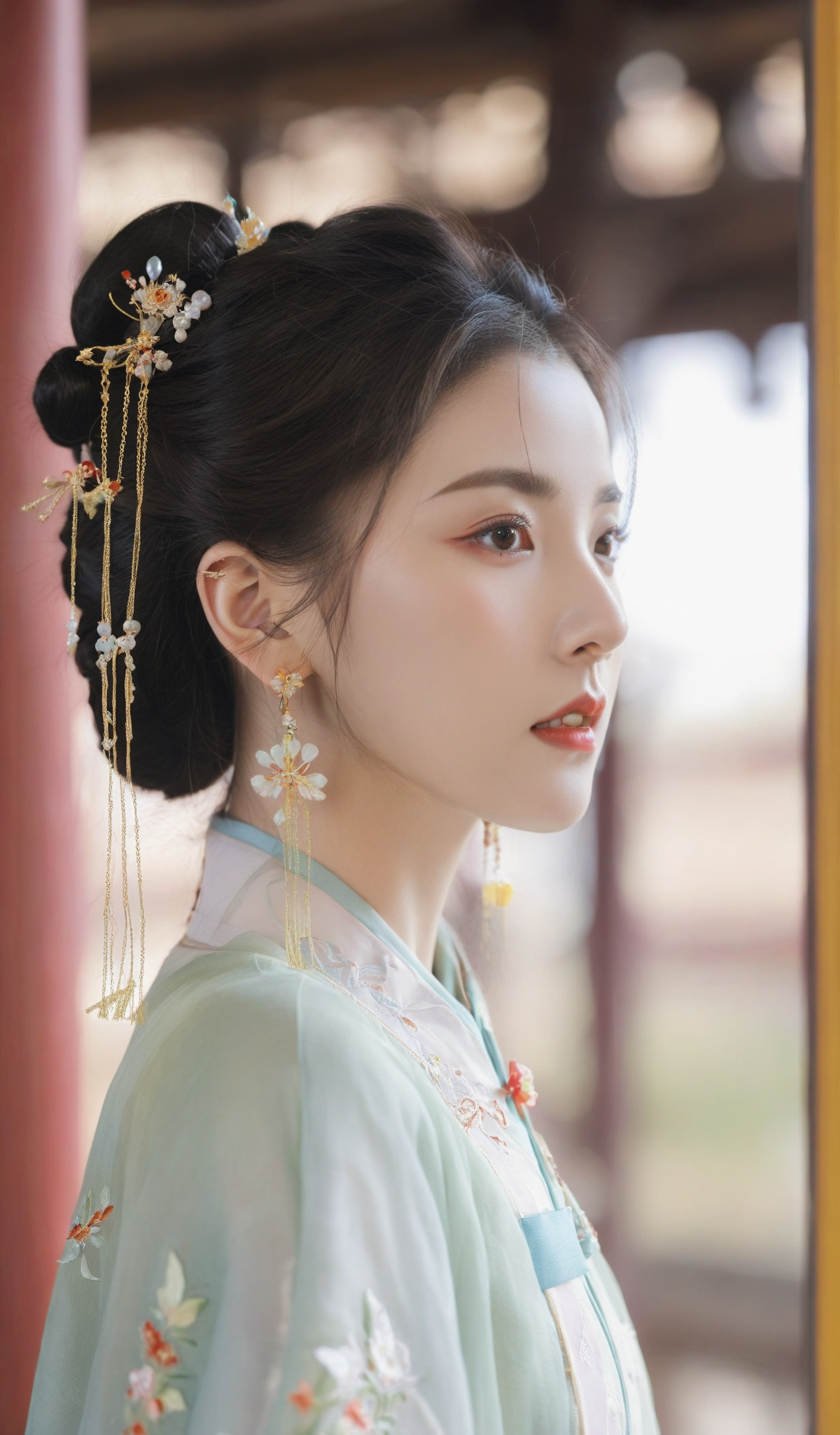 Realistic: 1.3, Masterpiece, Highest Quality, High Resolution, Details: 1.2, 1 Girl, Bun, Hairpin, Beautiful Face, Delicate Eyes, Tassel Earrings, Necklaces, Bracelets, Hanfu, Su Embroidered Hanfu, Streamers, Ribbons, Elegant Stand Posture, Aesthetics, Movie Lighting, Ray Tracing, Depth of Field, Layering,Fluttering, Hanfu, qingsha