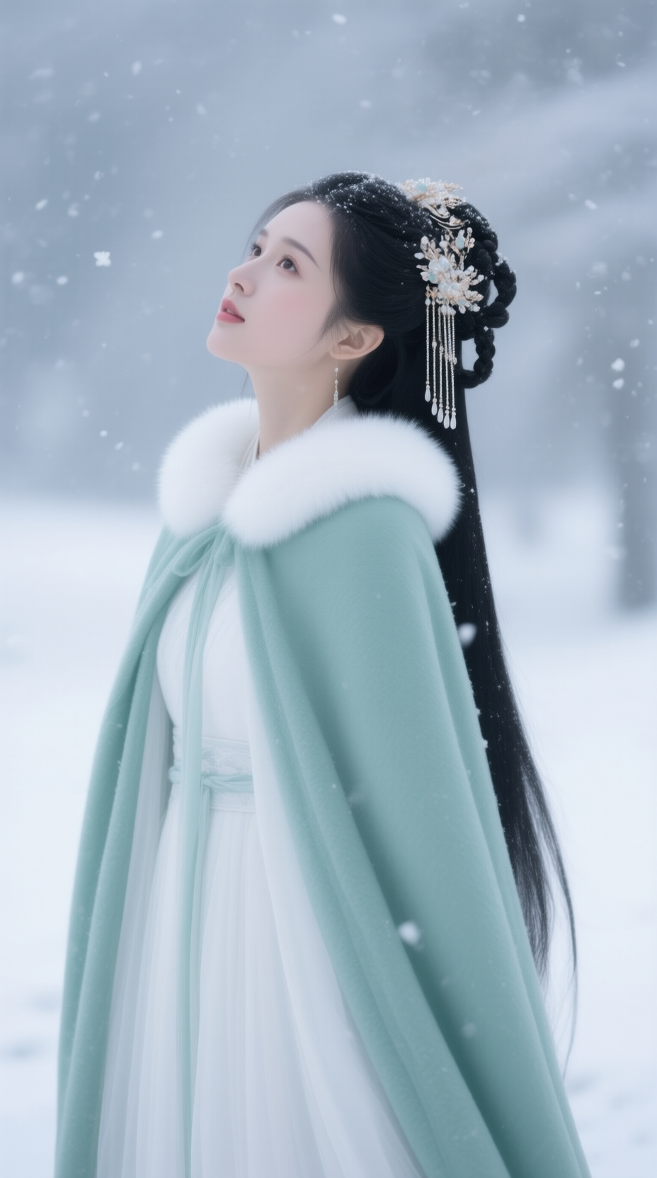 雪飞霜,黑色披发,美丽的面容,甜美的编发精致华丽的流苏头饰穿着洁白色裘皮古装长裙,披着冰绿色的斗篷站在雪地中,雪花飘落,朦胧氛围,正面像,抬头赏雪景,8K高清,真人