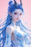 Light pink neon refraction effect,Martin Sci-Fi,AJFxian,qingshu,F10WS1L3M1N3,Feet,Fantasy realism,beautiful art,a cute girl playing by the sea,playing in a CGI image,there is a blue-haired woman in a high-collar short-sleeved blue dress,showing her shoulders. She has two dragon horns on her head,sitting_in_tree,legs hanging,blue sky and white clouds,clean sky,fantasy realism,beautiful art,silhouette color style,panorama,full shooting,looking at the audience from the side,short stature,Feet,