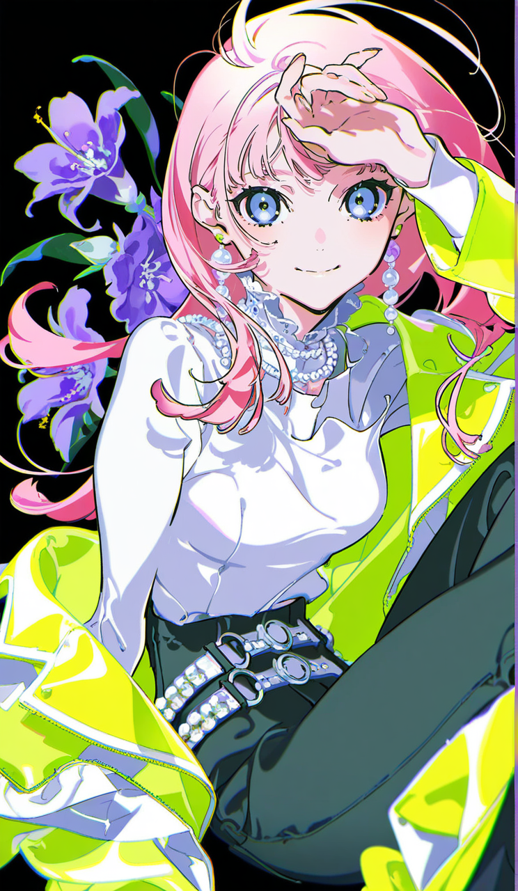 Yoneyama Mai,solo,1girl,blue eyes,flower,purple flower,long hair,looking at viewer,white shirt,jewelry,shirt,smile,pants,black background,long sleeves,earrings,pink hair,yellow jacket,pearl \(gemstone\),belt,<lora:Yoneyama Mai_v8-000010:0.65>,