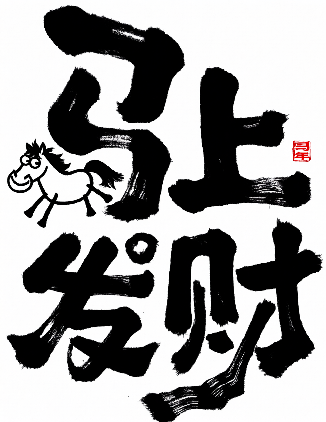 the image features bold, expressive chinese calligraphy in black ink on a white background, the characters read 马上发财 (mǎ shàng fā cái), meaning get rich quickly or instant wealth, a common auspicious phrase used during festive occasions like chinese new year, the brushwork is dynamic and thick, with visible texture suggesting traditional ink painting techniques, a playful cartoon horse, drawn in simple black lines with exaggerated features—such as large eyes and a smiling expression—is positioned near the top-left corner, partially overlapping the first character 马 (horse), this whimsical addition enhances the theme of speed and prosperity, as 马 (horse) symbolizes swiftness, in the upper-right corner, there is a small red seal stamp with two chinese characters: 马年 (mǎ nián), meaning year of the horse, indicating the designs connection to the zodiac year of the horse, the overall composition blends traditional artistry with modern humor, creating a joyful and celebratory visual message