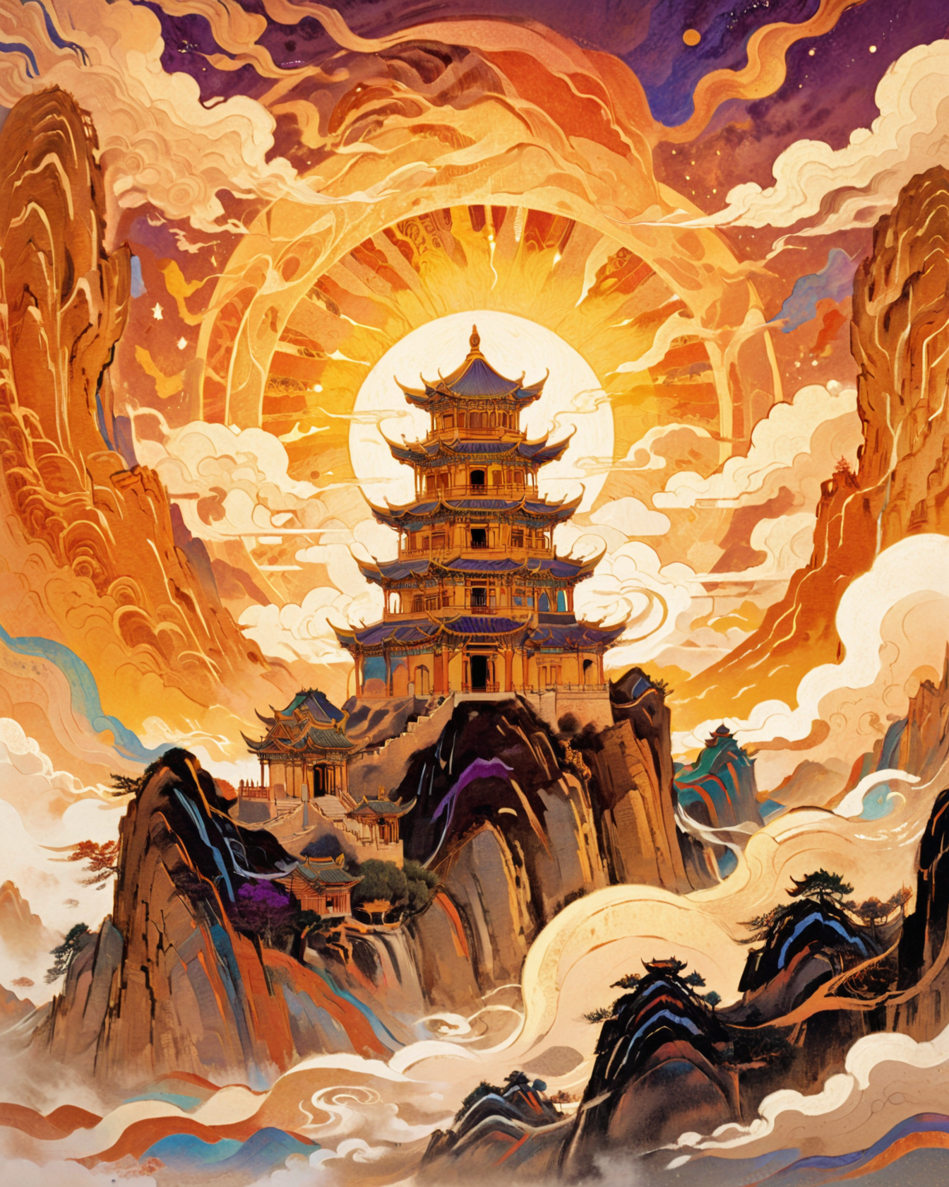 Psychedelic style Psychedelic style (warm-toned:1.2),early morning,the ancient pagoda on the mountaintop,(cloud:1.3),landscape,outdoors,star \(sky\),(big sun:1.4),(waterfall:1.4),(purple mist:0.5),lineart,ART NOUVEAU,dunhuang style,complex patterns,chinese classical patterns,