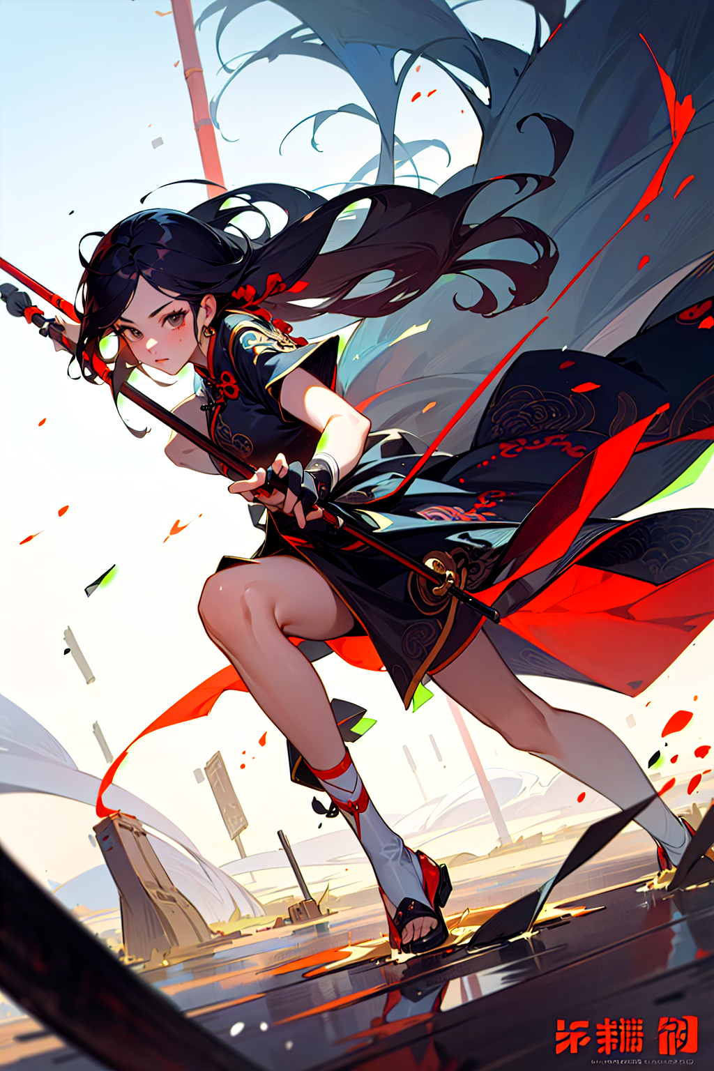 (1girl,Wielding a spear,Chinese weapons), battlefield, ancient times, strong winds, floating,chinese style,Chinese style, ink style, highly realistic,