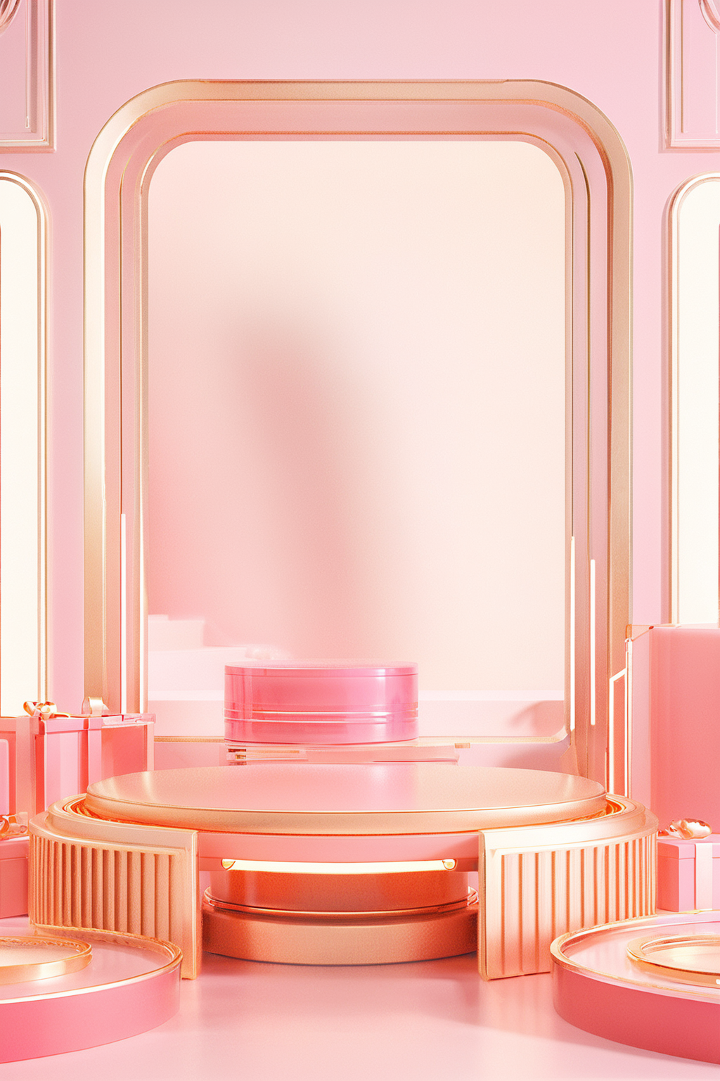 3D e-commerce skin care background, with a circular table in the middle, advanced background C4D texture (gold pink theme 1:1)
