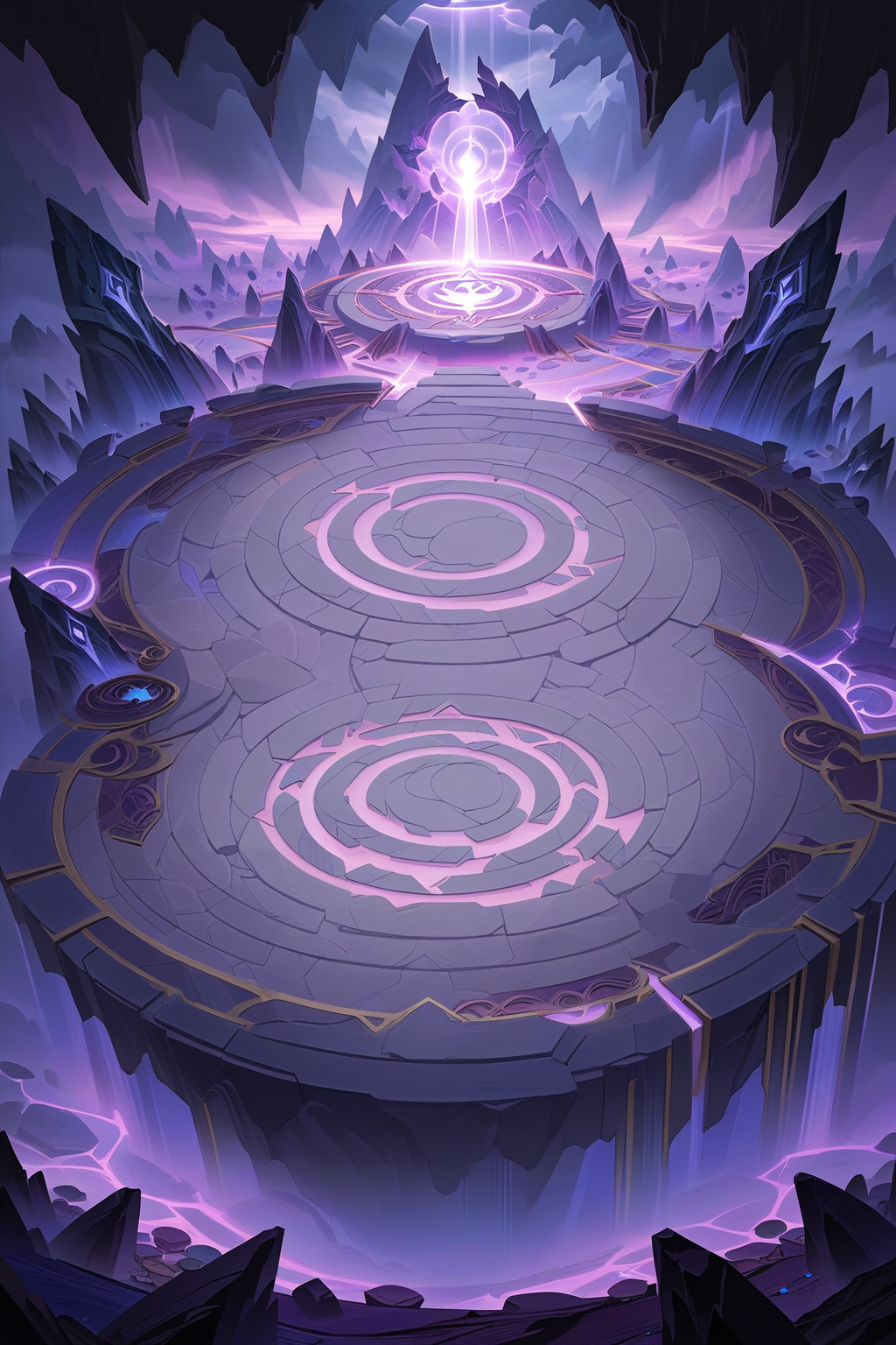 dark fantasy ritual site, circular stone platform with intricate purple glowing patterns in mountains, sharp black rocks surrounding the platform, massive purple mist and clouds above, giant bird-shaped halo with blue-purple light rays, mysterious and mystical atmosphere, style of Magic: The Gathering card art, hyperdetailed, volumetric lighting, 8k