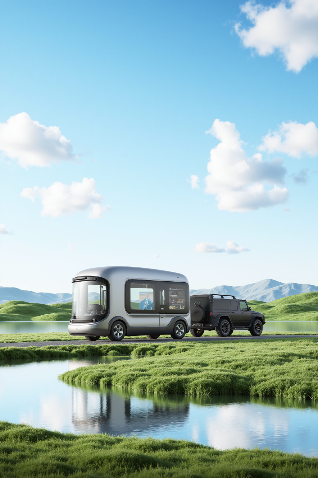 A CGI image depicting a futuristic, silver, compact, cylindrical vehicle with a digital screen on its side, parked on lush, green grass near a small, clear pond. The vehicle has a sleek, aerodynamic design and is accompanied by a black, rugged trailer. In the background, there are rolling hills and distant, misty mountains under a bright blue sky with scattered white clouds. The scene is serene and futuristic, blending natural elements with advanced technology.