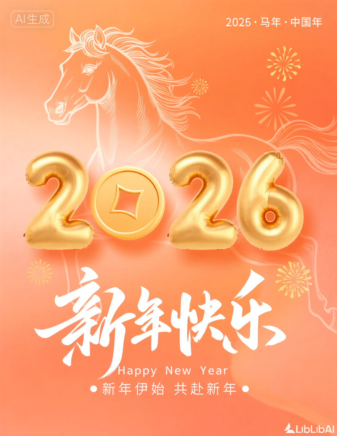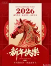 at the top right corner, the text 2026·马年·中国年 (2026·year of the horse·chinese new year) is written in white, below the central numbers, the phrase 新年快乐 (happy new year) is written in bold, flowing calligraphy, followed by its english translation happy new year, beneath that, a smaller line reads 新年伊始 共赴新年 (new year begins, together we welcome the new year), conveying unity and shared celebration, the overall design blends modern aesthetics with traditional chinese symbolism