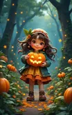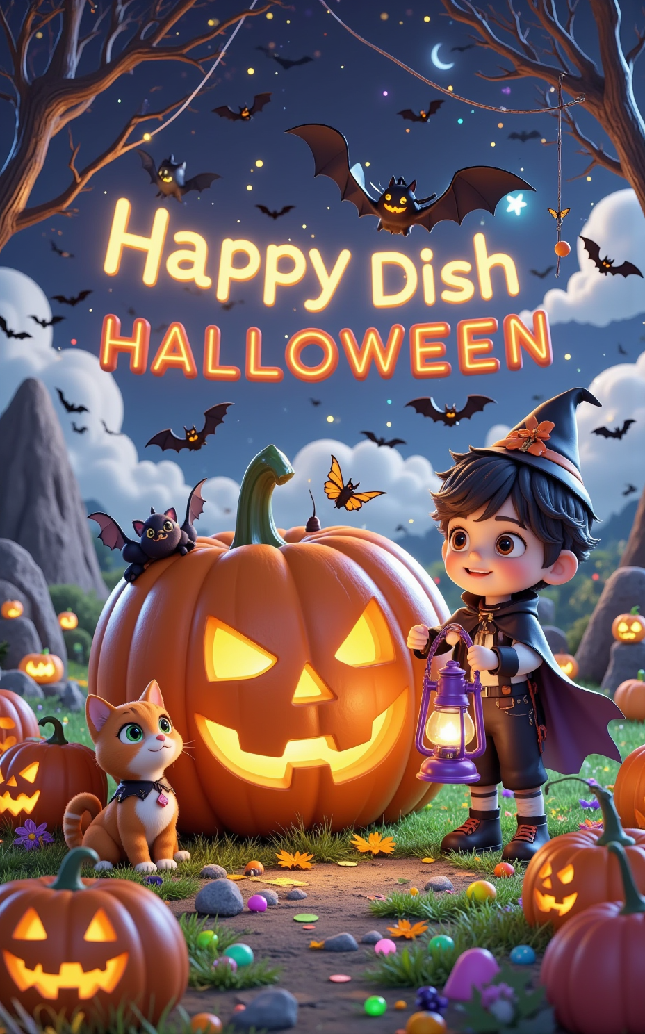 The image is a digital illustration of a Halloween-themed scene. A large orange pumpkin with a jack-o'-lantern face carved into it sits on a patch of green grass. On the right side of the pumpkin stands a boy. The pumpkin is surrounded by other pumpkins of different sizes and colors,including orange and red. The boy is holding a purple and white lantern in his hand. In the background,several bats are flying in the sky,their eyes shining with light. There are also white clouds and a spider web hanging from a string. The overall theme of the image is spooky and festive. At the top right corner,the text "Happy Dish Halloween! "is written in a playful font. Additionally,the image shows two cartoon characters,a boy and a cat,The boy is wearing a black cape and a pointed hat. He has black hair and is looking up at the sky with a curious expression. The orange cat with green eyes is sitting on the ground next to the boy,and there is a large rock formation in the distance,The overall mood of the image is playful and whimsical .,