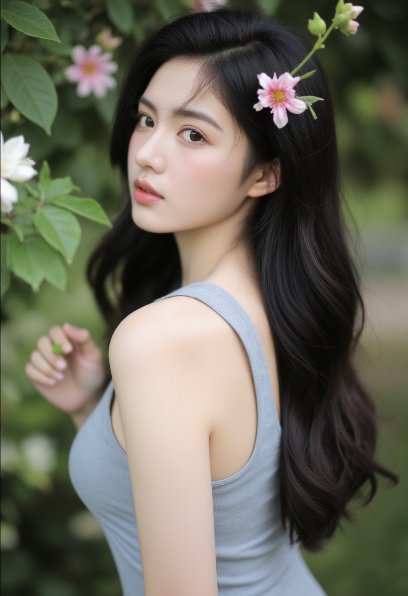 A beautiful and youthful Chinese model, 18 years old, showcases her striking looks with a slender body, perfect face, exquisite eyes, and luscious lips., Create a photorealistic portrait of a young woman with striking green eyes, alabaster skin, and raven-black hair cascading down her back, captured from an unusual 'bug's-eye view' perspective as she stands in a serene garden. Her delicate features are accentuated by the soft, dappled sunlight filtering through the lush foliage, casting intricate shadows that play across her face and the surrounding flowers. The scene evokes a sense of introspection and serenity, as her gaze appears to pierce through the vibrant colors of the blossoms and leaves, enveloping both subject and viewer in a tranquil embrace.