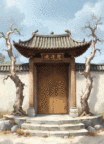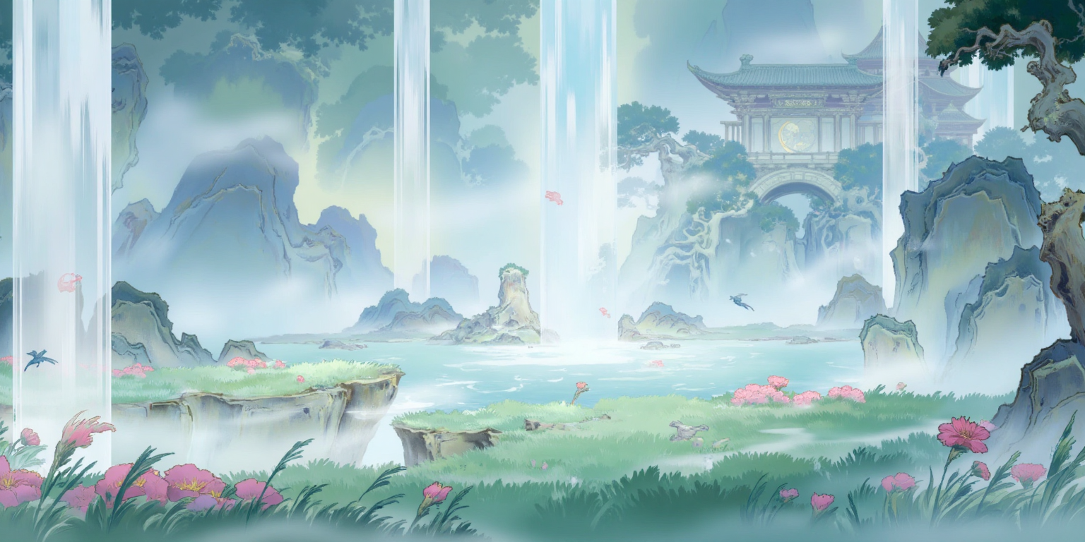 fgcjcj_v3,jnjhyx_v6_1,jnjhyx_v5,Dreamy Flower Sea Style,Long Shot,Contrast of Delicate Pink Flower Sea and Emerald Green Grassland,scenery, cloud, mountain, sky, tree, water, outdoors, moon, no humans, waterfall, day, lake, bird, castle, landscape, nature, fantasy, sun, crescent moon