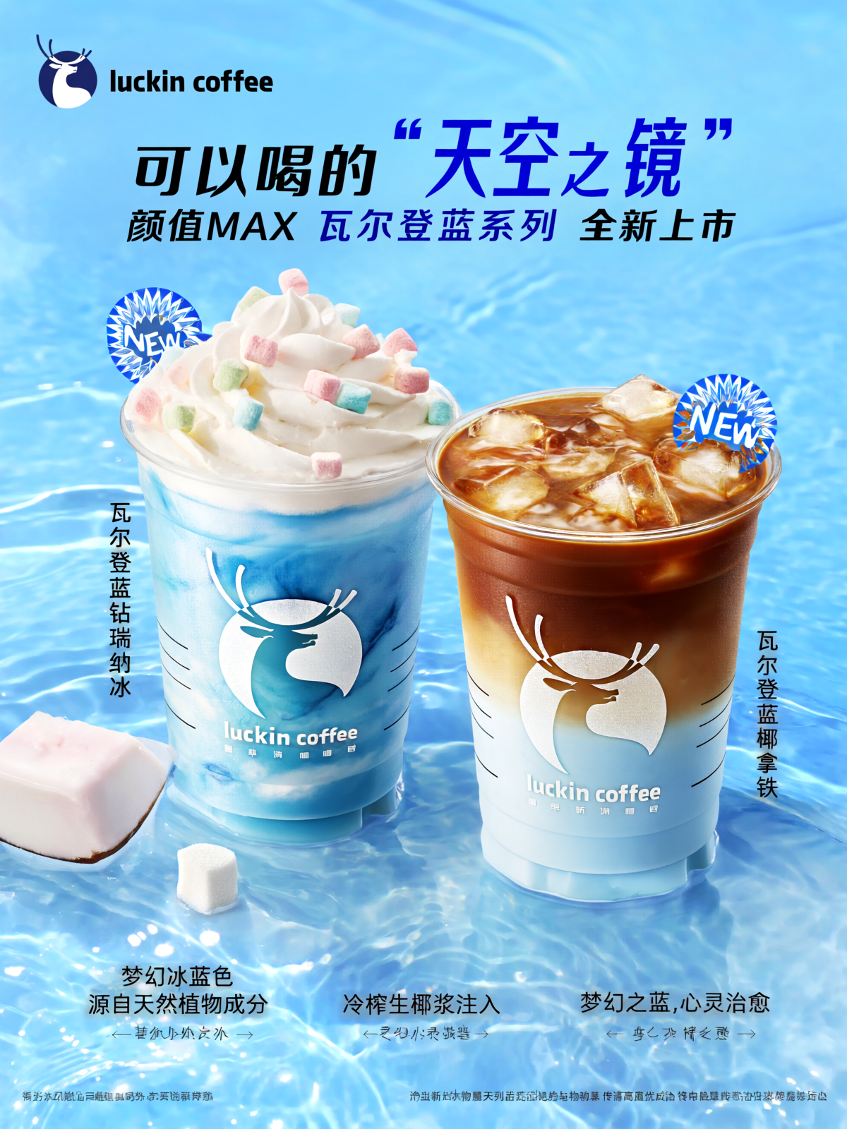 这是一张瑞幸咖啡“瓦尔登蓝系列”新品宣传海报,背景为蓝色水波纹,营造出清凉梦幻的氛围,左上角是“luckin coffee”品牌标识,上方醒目标语“可以喝的‘天空之镜’ 颜值MAX 瓦尔登蓝系列 全新上市”,吸引视线,