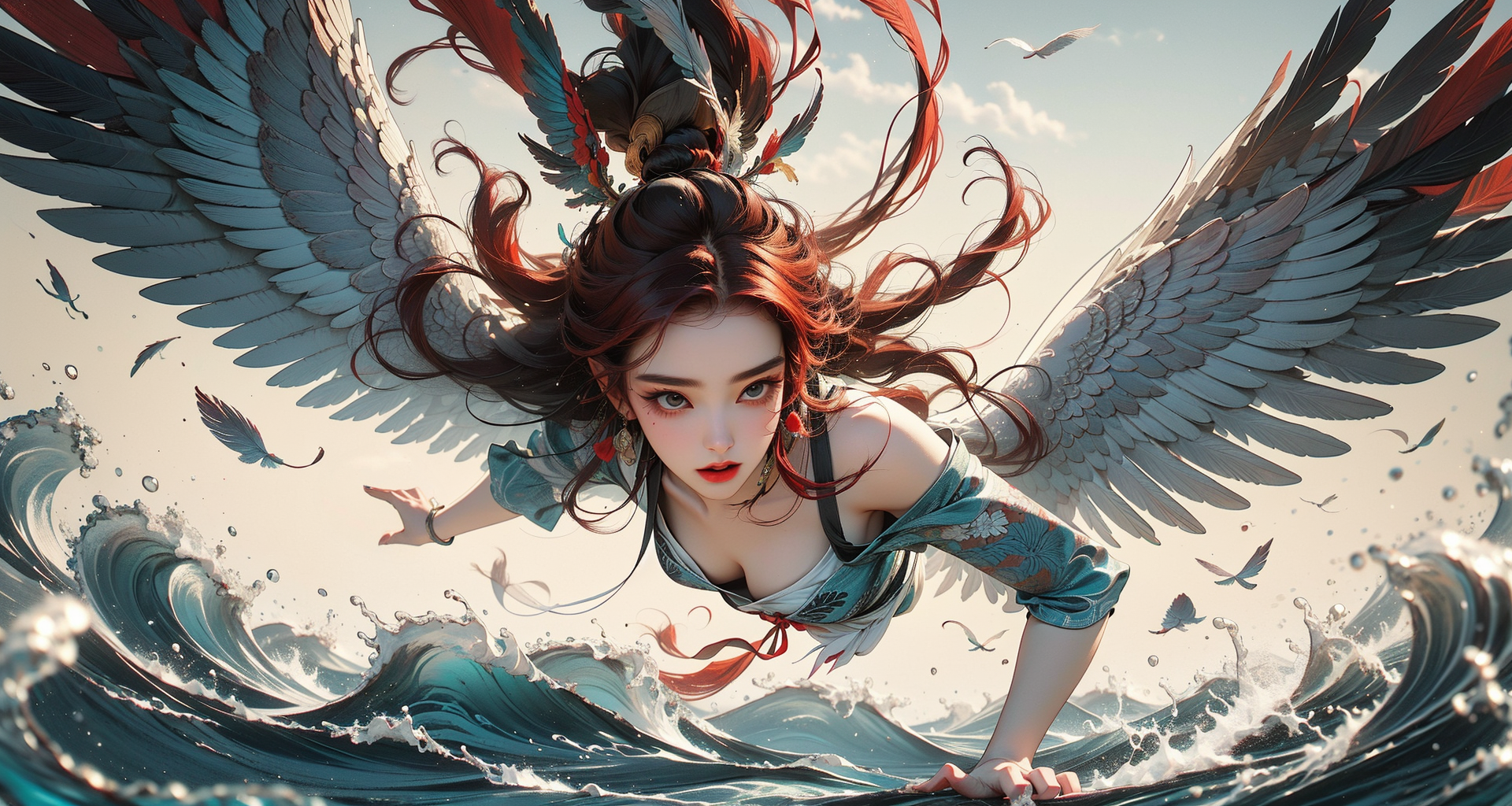 angel_wings,feathered_wings,feathers,wings,1girl,white_wings,spread_wings,bird,single_wing,angel,white_feathers,black_wings,harpy,dove,winged_arms,eagle,bird_wings,solo,rooster,breasts,black_feathers,cleavage,year_of_the_rooster,long_hair,multicolored_wings,feather_hair_ornament,feather_trim,off_shoulder,flying,talons,water,bird_tail,large_wings,brown_wings,