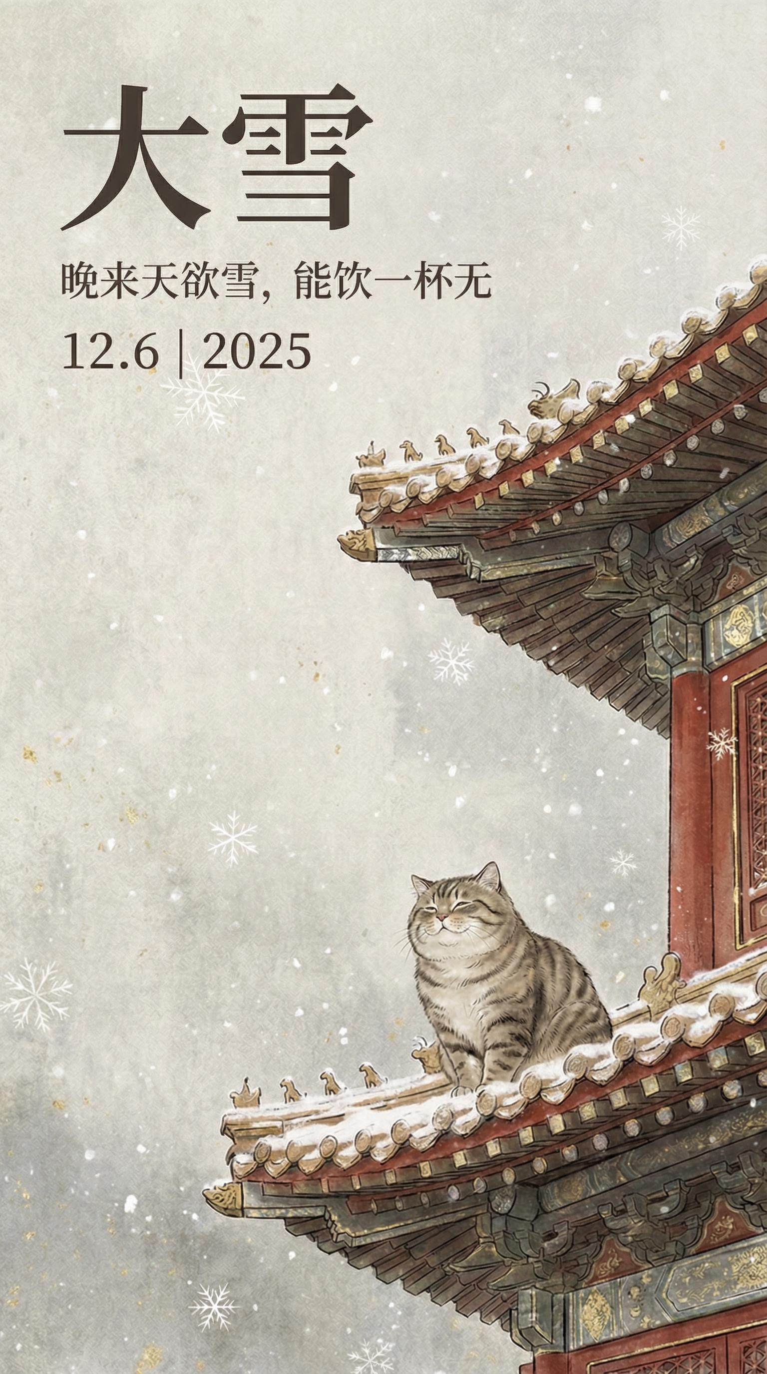 将画面中的文字排版位置改成画面左上方,书法文字是“大雪”,以典雅粗衬线体醒目放大,作为主标题垂直布局。紧随其下,“晚来天欲雪,能饮一杯无”以纤细优雅衬线体呈现,字间距适中,作为副标题。再下方,“12.6 | 2025”以精炼衬线体水平排布,