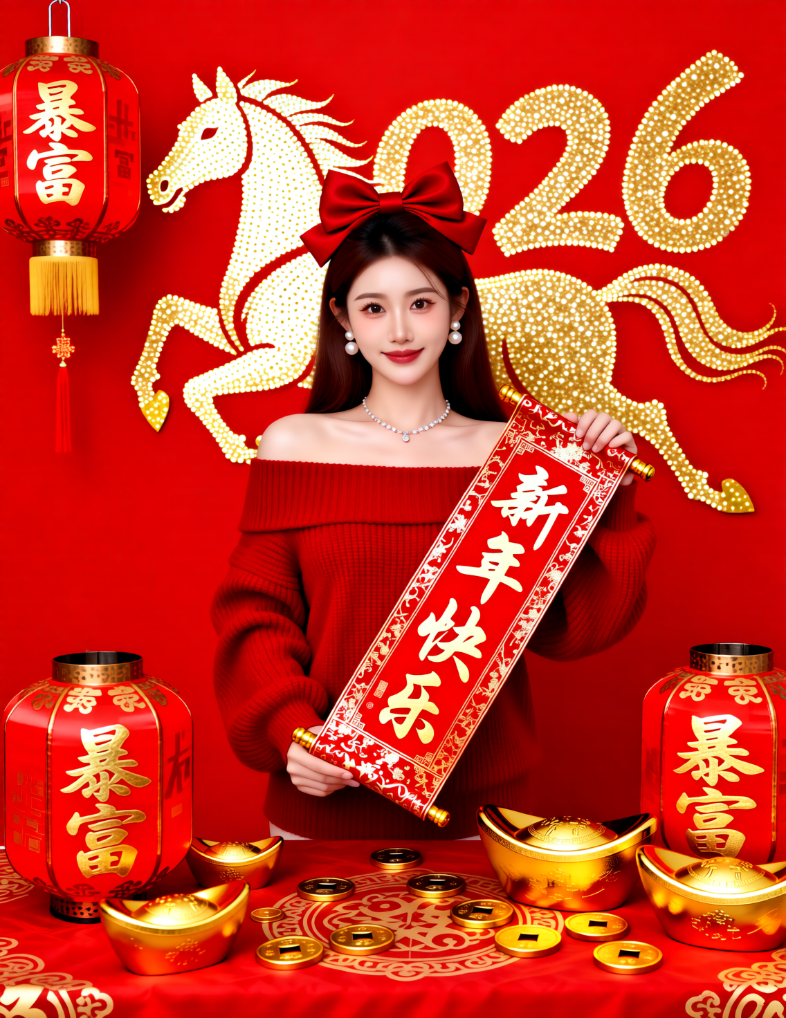 该图像以充满活力的红色和金色的喜庆春节场景为特色,一名穿着红色露肩毛衣的妇女站在中央,手持红色卷轴,上面写着金色的汉字 “新年快乐”,她编织着深色的长头发,上面装饰着红色的大蝴蝶结,戴着珍珠耳环和一条精致的项链,在她身后,鲜红色的背景上装饰着一条与2026年交织在一起的金色马,由闪闪发光的圆点制成,在左边,悬挂着一个传统的红色灯笼,上面刻有相同的 “暴富” 铭文,另一个相同的灯笼放在桌子上,桌子上摆满了象征财富的金锭和硬币,桌布是红色的,带有错综复杂的金色图案,增强了庆祝气氛,整体构图散发出与农历新年相关的繁荣,欢乐和文化丰富,