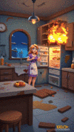 A curly-haired girl in a patched dress sits on the snow-covered floor, holding an old, tattered book with a melancholic expression in a dilapidated room with cracked wooden doors and broken windows revealing fluttering curtains. The walls are adorned with tilted clocks, and there is a faded blue sofa covered with burlap strewn with debris, including shattered floor tiles and frost patterns, using a desaturated palette of slate gray and faded indigo. The surface features semi-transparent layered dynamic snow, and the poor texture of peeling wallpaper and frozen wood grain creates a survival puzzle game aesthetic. Movie lighting projects slender shadows from the broken window frames, and visible breath vapor emphasizes the freezing point. Interactive elements around UI buttons emit a faint glow, and the scene is rendered with Unreal Engine 5, featuring subsurface scattering on snowflakes.