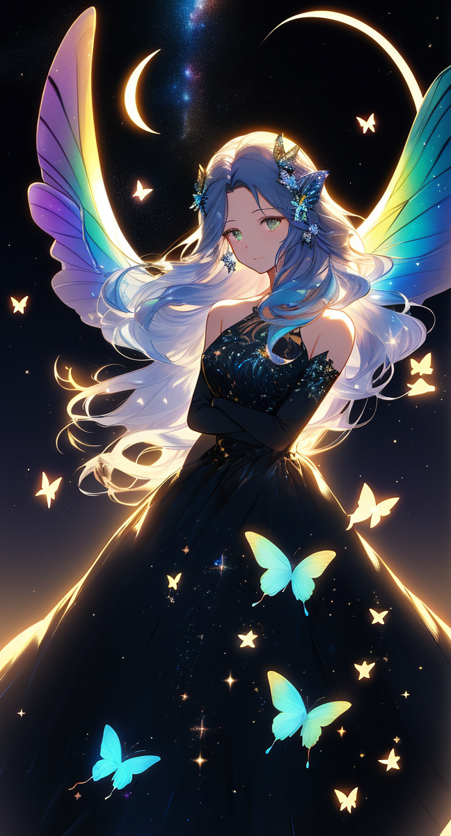 1girl,aurora,bare_shoulders,black_dress,blue_butterfly,blue_hair,bug,butterfly,butterfly_hair_ornament,butterfly_on_hand,butterfly_print,butterfly_wings,constellation,constellation_print,crescent,crescent_moon,dress,elbow_gloves,galaxy,glint,gloves,glowing_butterfly,hair_ornament,jewelry,light_particles,long_hair,milky_way,moon,night,night_sky,own_hands_together,planet,saint_quartz_\(fate\),shooting_star,sky,solo,space,sparkle,sparkle_background,standing,star_\(sky\),star_\(symbol\),starry_background,starry_sky,starry_sky_print,very_long_hair,white_butterfly,yellow_butterfly,<lora:最后天使-0005:0.8>,