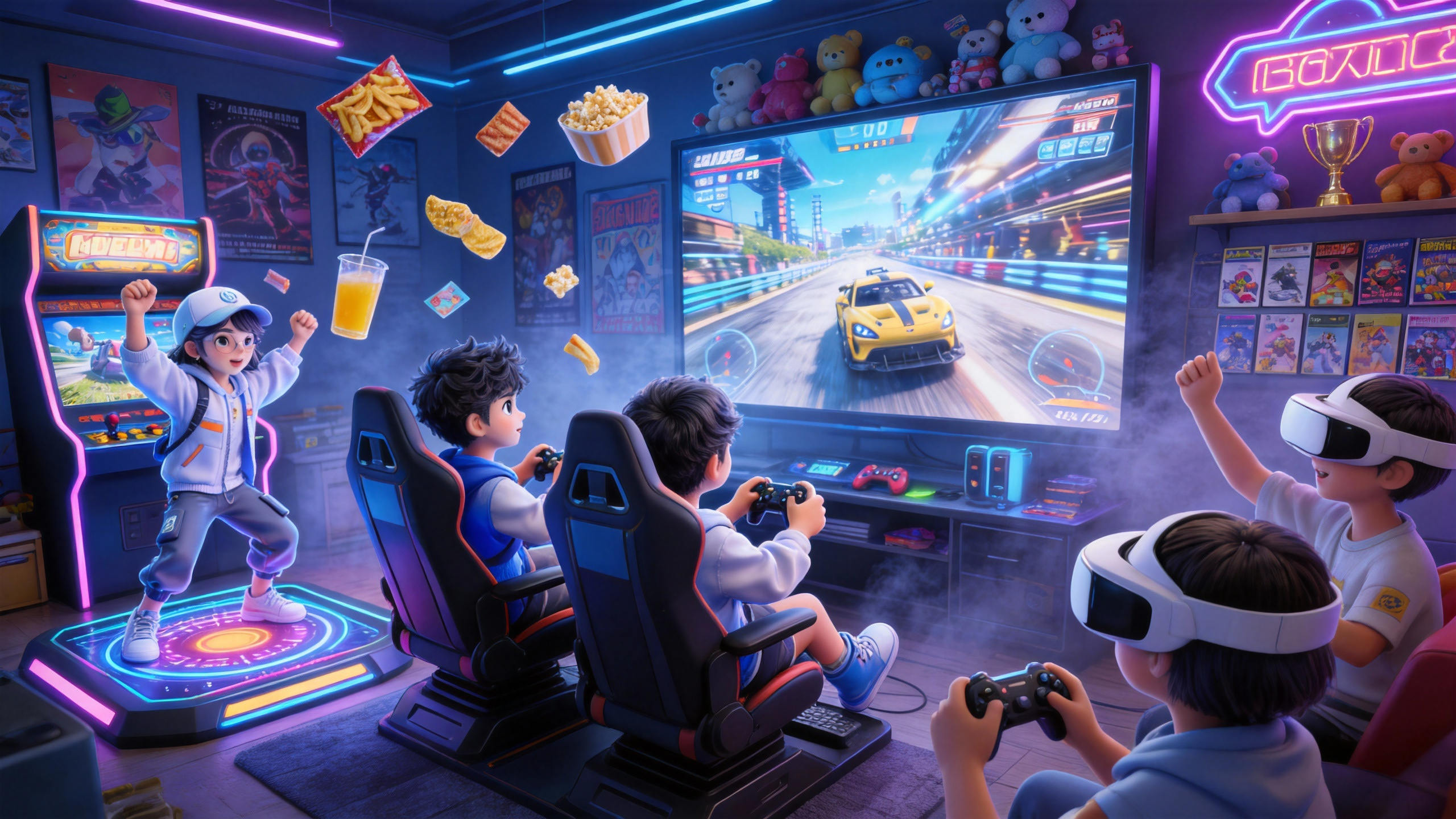 3D卡通风格。孩子们沉浸在一个充满乐趣的游戏室里,整个画面充满了活力和兴奋。房间里的灯光五彩斑斓,墙上挂着各种游戏主题的海报,周围布满了闪亮的霓虹灯和充满科技感的装饰,给人以强烈的电子竞技氛围。房间中央是一台大屏幕电视,屏幕上展示着一款充满卡通风格的赛车游戏。几个孩子坐在舒适的游戏椅上,紧握着游戏手柄,全神贯注、激烈地竞技。他们的表情生动:有的孩子睁大眼睛盯着屏幕;有的嘴角上扬,仿佛在庆祝他们的“胜利”。每个孩子身边都摆放着一些零食和饮料,如薯片、爆米花和果汁,增添了轻松愉快的气氛。在游戏机的角落里,一些孩子在玩经典的街机游戏,有的在玩《拳皇》,有的在玩跳舞机。整个场景充满了游戏的多样性。一个孩子站在跳舞机上,随着节奏快速移动,周围的孩子为他加油。笑声和欢呼声此起彼伏。房间角落里摆放着几台色彩鲜艳的手持设备和虚拟现实头戴设备。一些孩子好奇地戴上VR头盔,手里挥舞着控制器,体验身临其境的虚拟冒险。孩子们周围还摆放着各种游戏道具,如卡通人物的玩偶、游戏奖杯和收藏卡,营造出沉浸式的游戏氛围。整个场景充满了活力,明亮的霓虹灯光和阴影交织,创造出一个充满科技感和童趣的环境。这个房间就像一个儿童游戏乐园,邀请人们加入游戏,享受乐趣和互动时光。