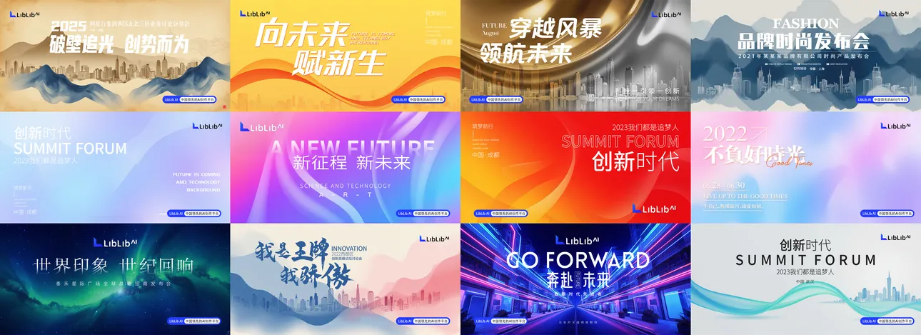 1.流体化作水墨晕染,背景用青灰、黛蓝渐变,城市建筑淡墨轻描,似烟雨江南的水墨长卷,传递东方禅意。