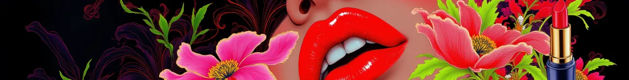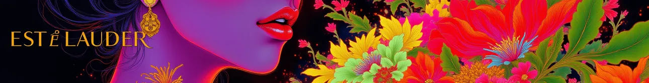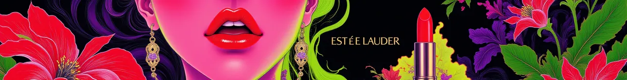 Martin fashion illustration,fluorescent color,Apple logo,text big words 'Est é e Lauder',Est é e Lauder lipstick advertisement, a lipstick from Est é e Lauder,with a female modle,red lips,beautiful flowers,red and black theme,