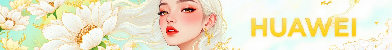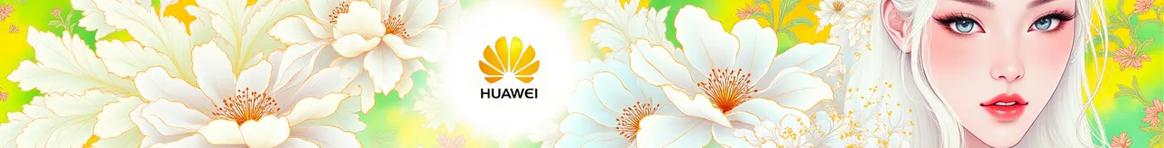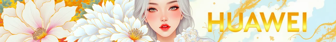 Martin fashion illustration,fluorescent color,Huawei mobile phone print advertisement, featuring a Huawei logo,,text big words 'HUAWEI',a female modle,sliver hair,beautiful flowers,white and golden theme,