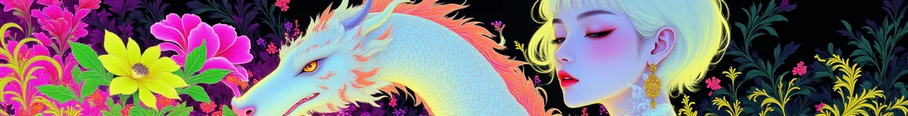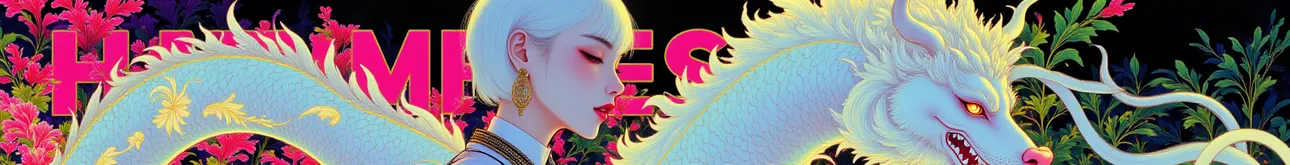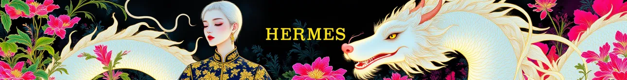 a white female model with short hair with a white chinese dragon,flowers,in dark,Hermes print advertisement with gold, pink, and black themes,