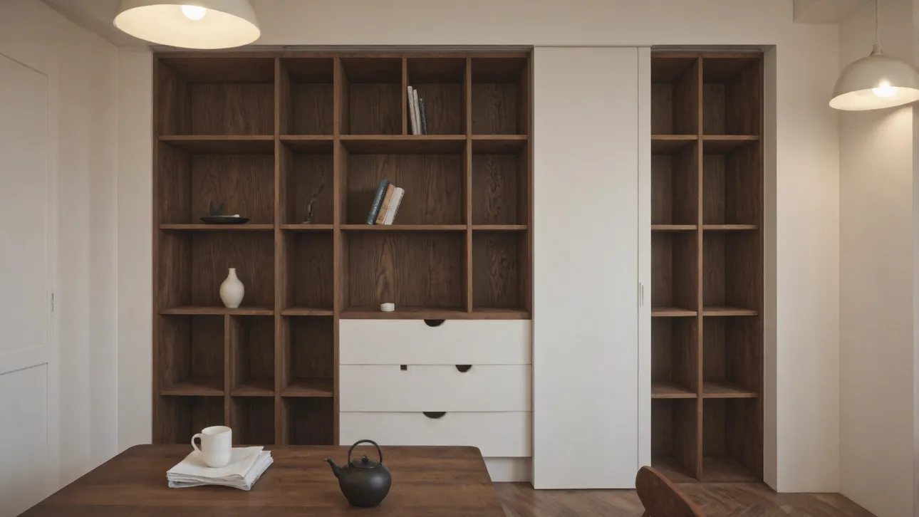 - 设计将自然木材的温暖与极简艺术和谐地融合在一起,营造出宁静而高雅的氛围。高质量木材的使用,体现在简洁的柜子和木质桌子上,引入了一种有机质感,与光滑、单色调的墙壁形成了美丽的对比。