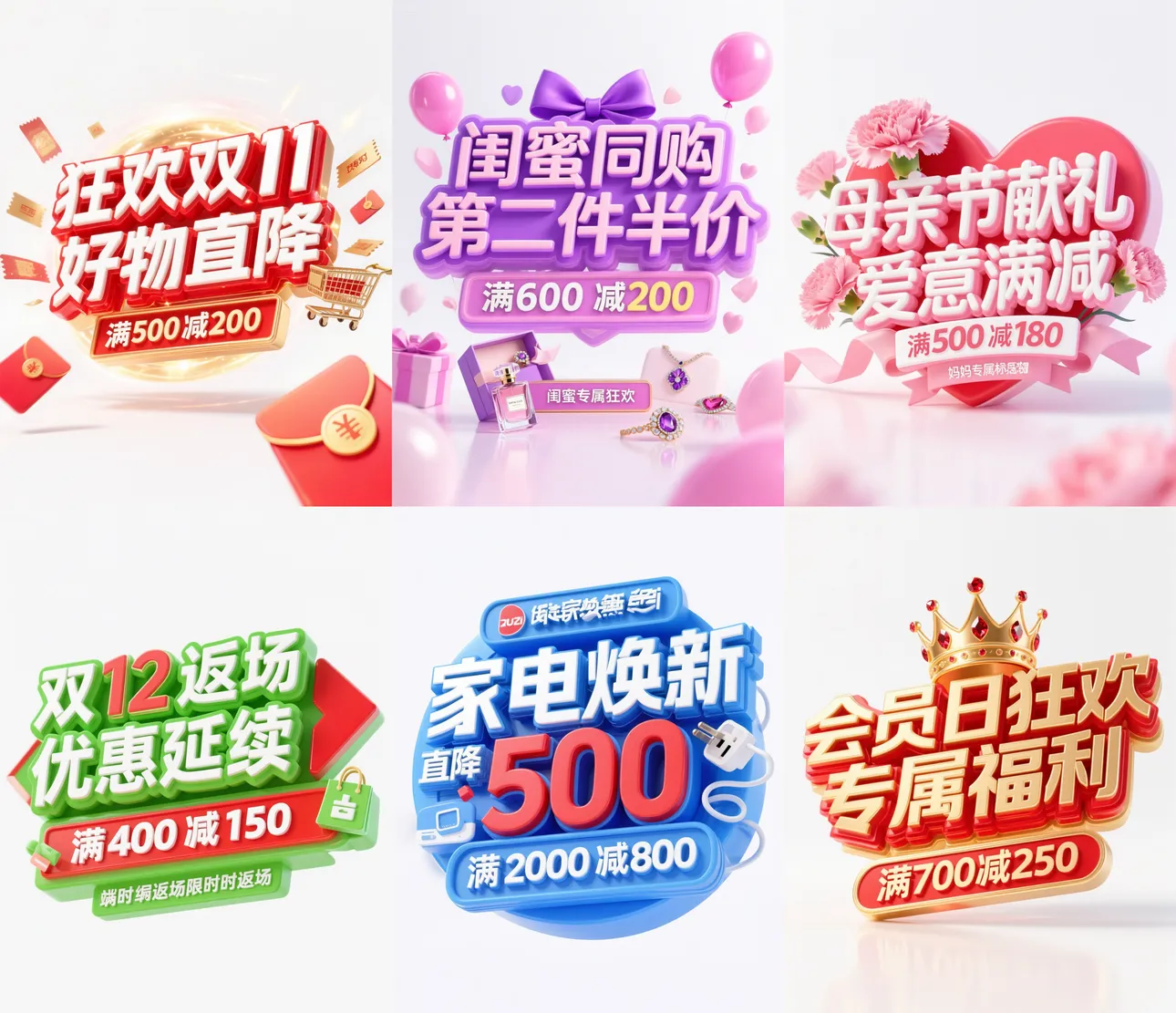 该模型聚焦于节日和电商活动的立体标题设计,高效创建吸引眼球的宣传海报立体字,生成专业级促销视觉立体字效果,结合了强烈的主题性和营销导向。