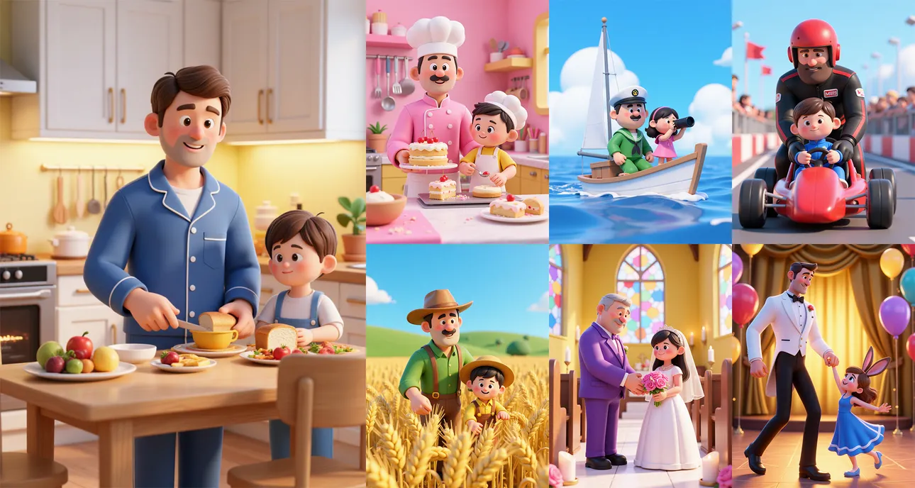 专为父亲节营销场景打造,模型能快速生成包含父子互动、礼物元素(如奖杯、领带、茶杯等)的3D立体海报,结合“感恩父爱”“限时优惠”等促销文案,轻松营造温馨与促销并重的视觉氛围。例如,可生成“父子拥抱在草地”“父亲与孩子共同拆礼物”等经典场景,并支持添加动态光影和节日文字特效。