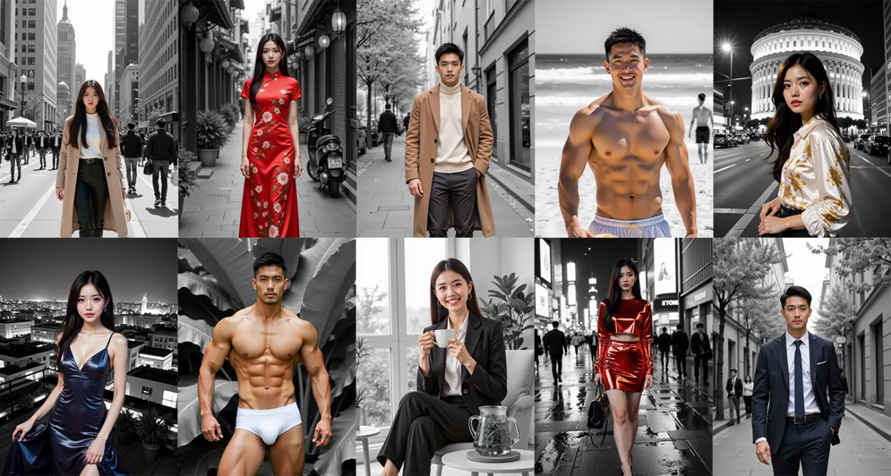 基于Flux-Realism或Flux-Art基础模型,通过AI分层算法锁定人物全身(含服饰、手持道具)并保留全彩细节,同时将背景转化为高对比度灰阶,避免传统黑白滤镜的“泛黄”或“噪点”问题 。
