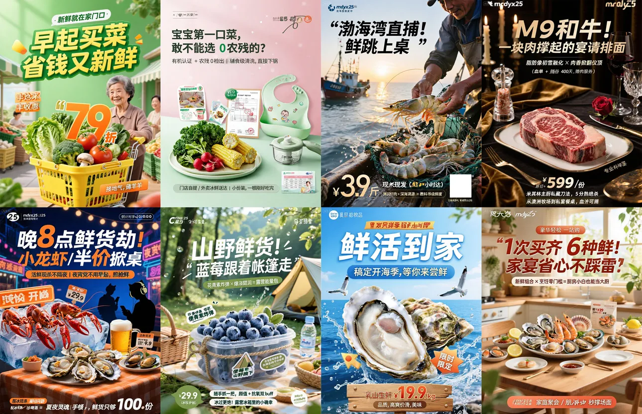 本模型可轻松生成生鲜海报设计,内容并具备良好的质感,在精细细节表现上有丰富的表达。