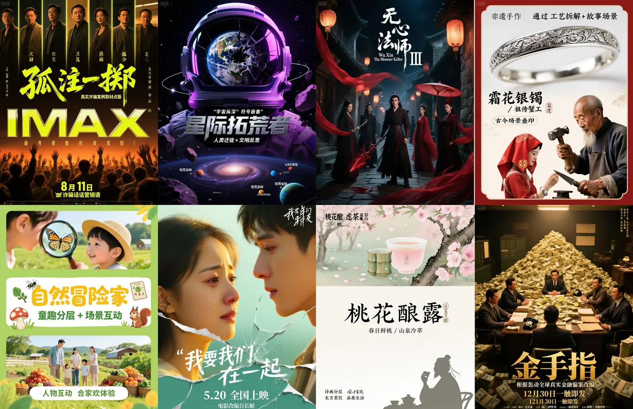 本模型可轻松生成电影海报设计,内容并具备良好的质感,在精细细节表现上有丰富的表达。
