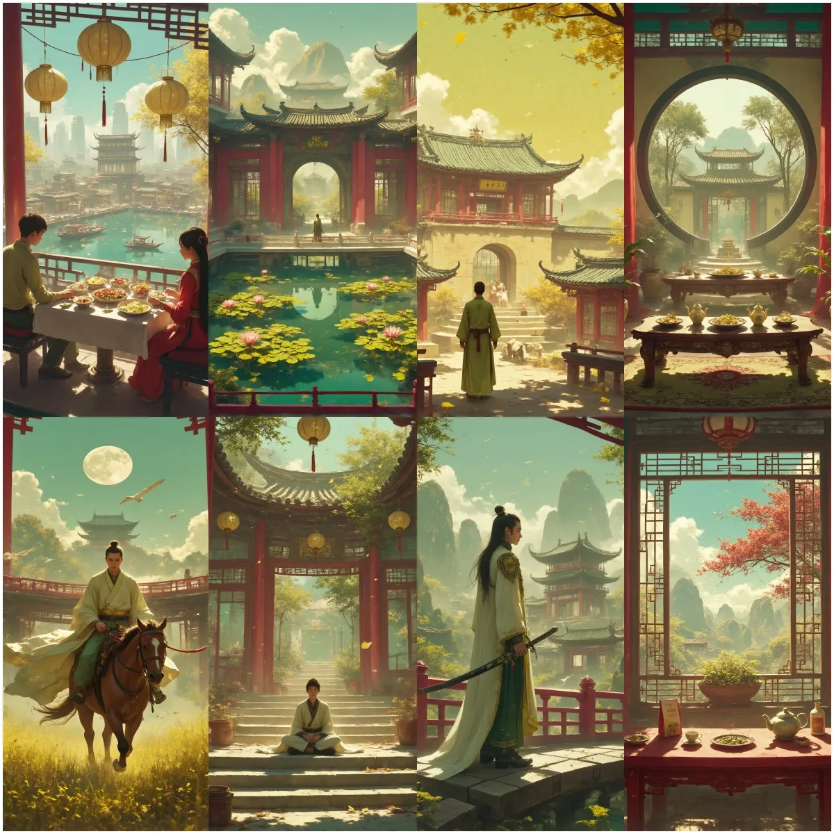 搭配标签:# 新国风插画 #东方美学 #古风人物 #传统纹样 #水墨意境 #国潮设计,或加入具体元素关键词(如「敦煌飞天」「江南烟雨」「瑞兽麒麟」)、场景关键词(「月下对酌」「茶马古道」「花朝节」),精准触发风格效果。