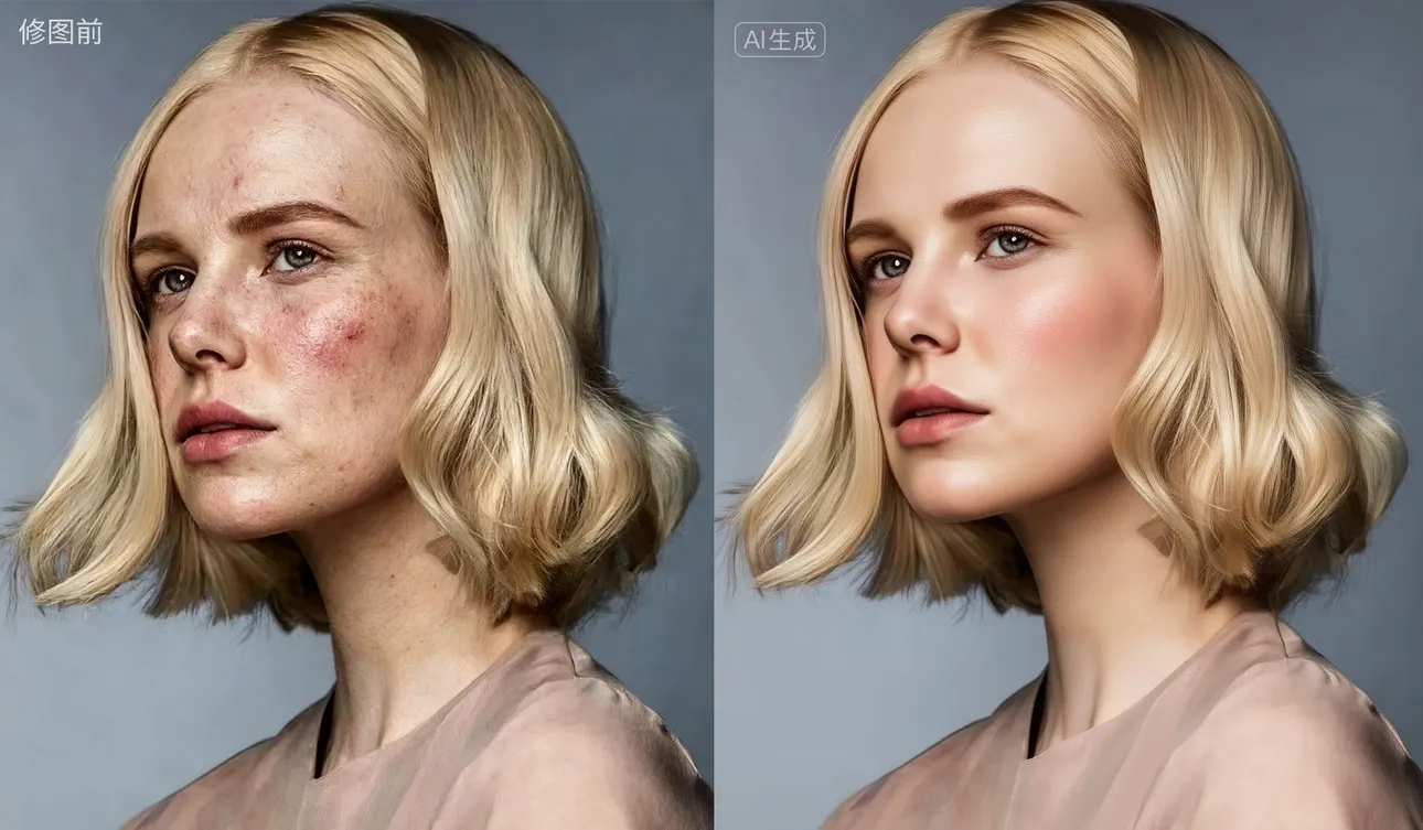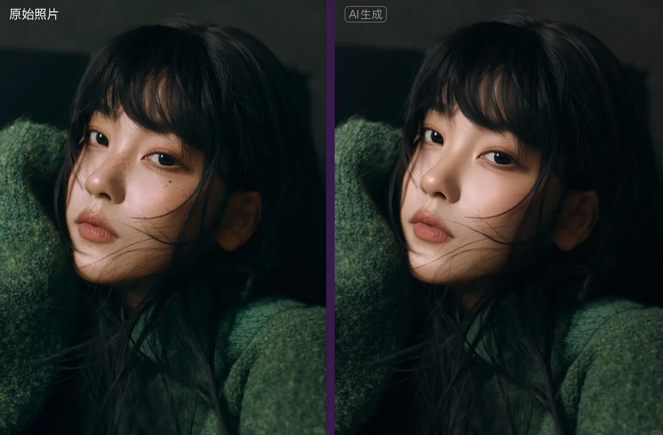 清除所有脸部皮肤的雀斑和痣,最终照片中人物的脸部皮肤为洁净白皙。修复原始照片,最终输出高清画质的照片。