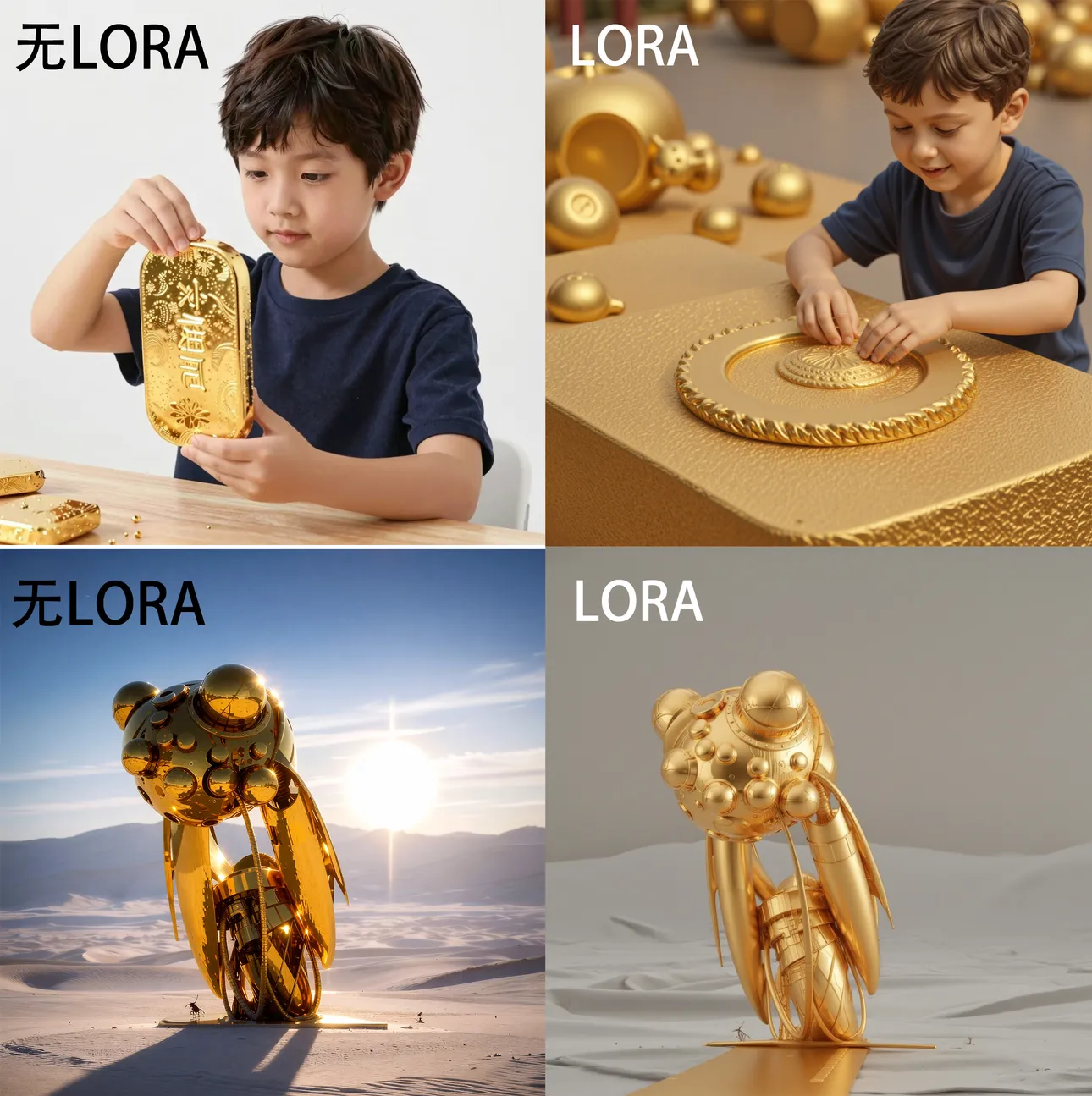 可以看出来没有LORA的黄金类似鎏金或者镀金,真实感很弱