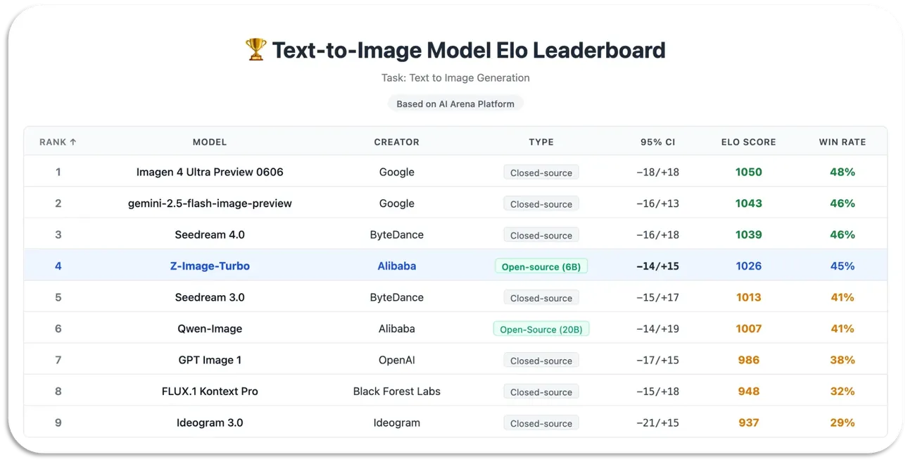 根据基于Elo的人类偏好评估(AI Arena),Z-Image-Turbo在与其他领先模型中表现出高度竞争力,同时在开源模型中取得了最先进的成绩。