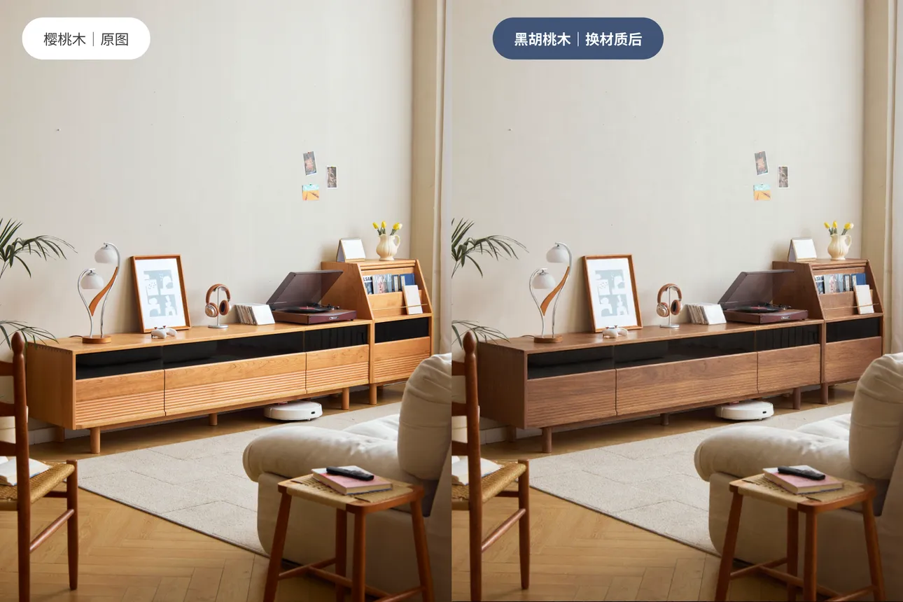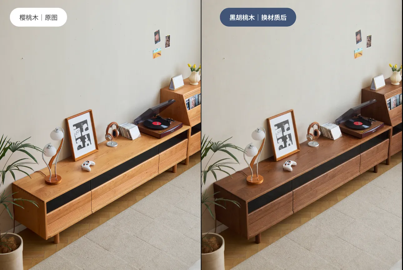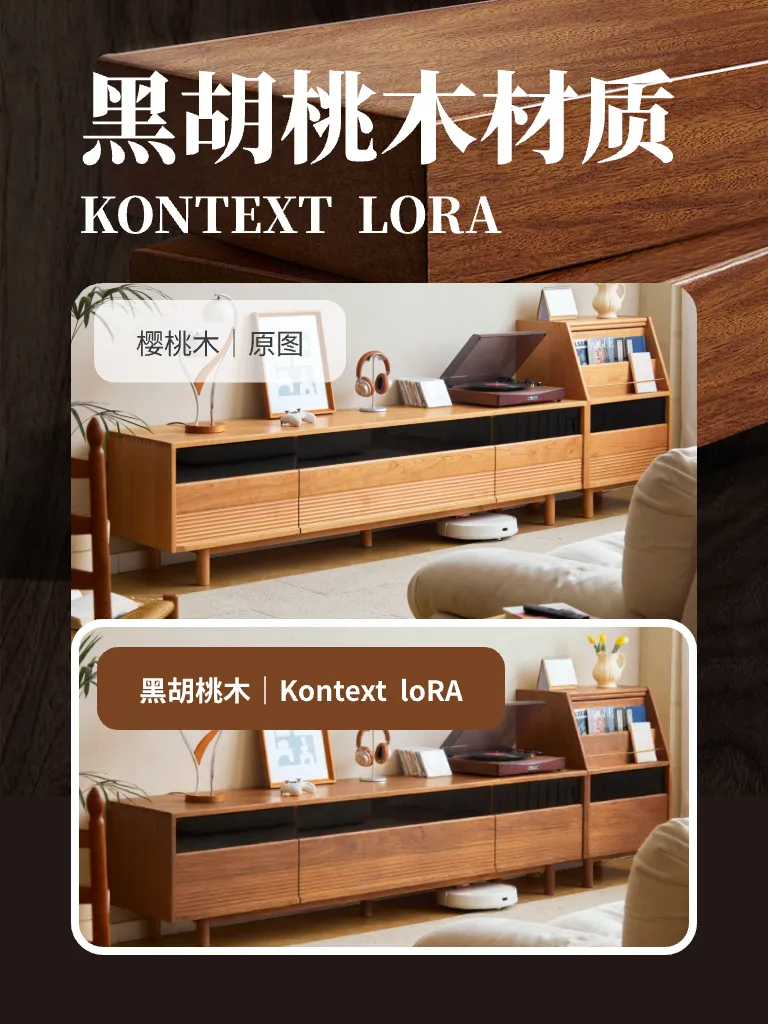 这是一款最新的材质模型loRA,搭配最新的F.1 Kontext Dev 一键更新任何家具的材质为黑胡桃木。