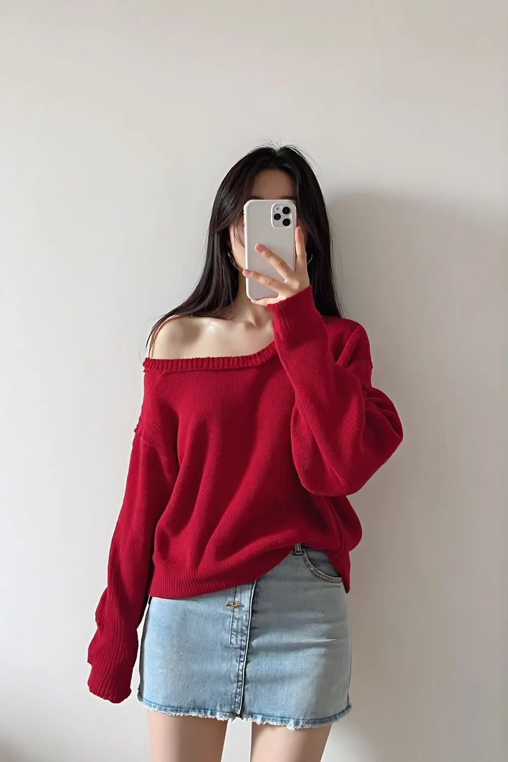 A woman is taking a mirror selfie in a white photostudio. She is wearing a red sweater. The sweater is slightly oversized. She pairs it with a light blue mini skirt. The woman has long, dark hair that falls over her shoulders. The photostudio is well lit, the background is pure white, can not see any debris.