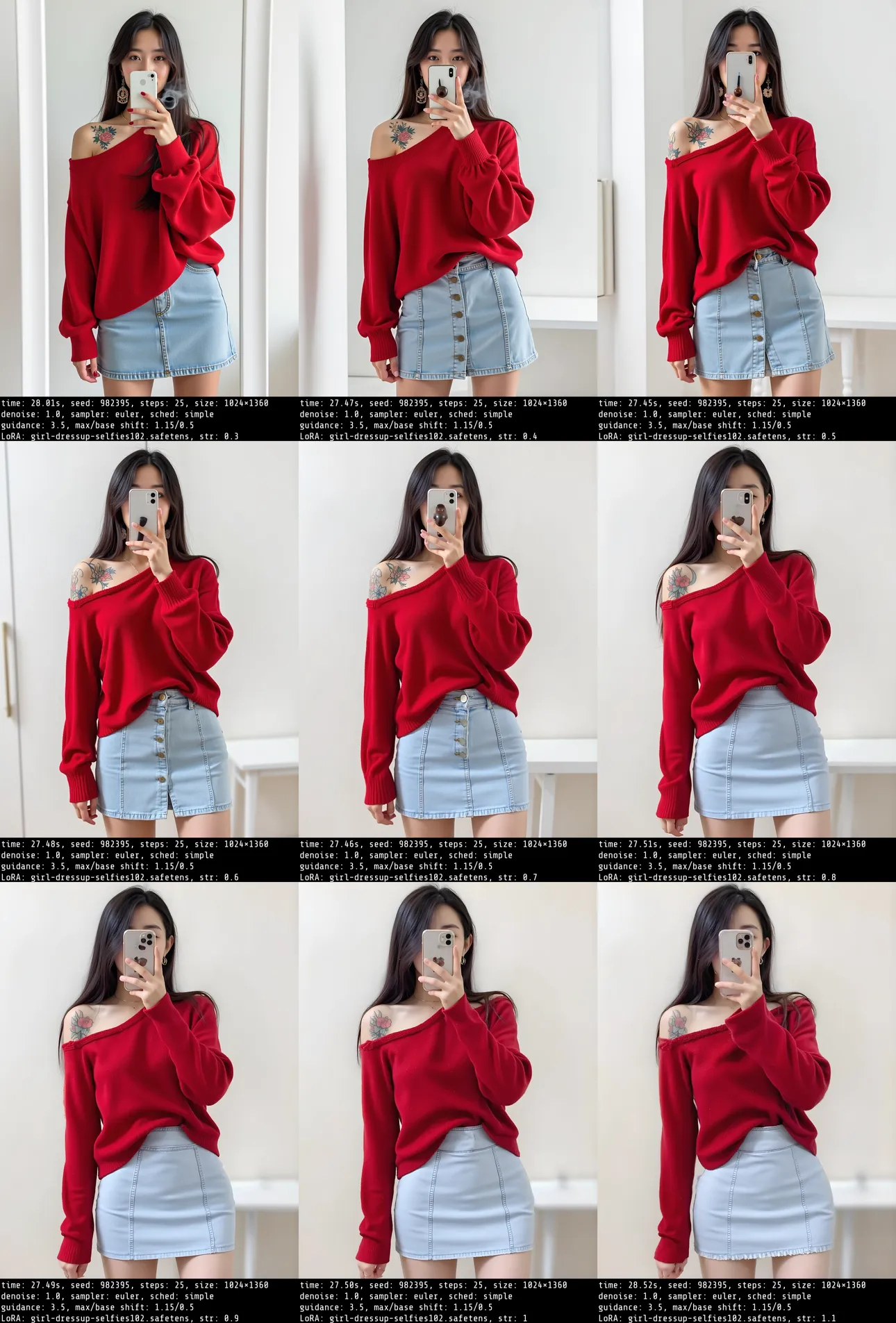 使用原始FLUX模型不容易做到手机自然的挡住脸进行自拍,当本模型权重增加到0.8左右时,手机会自然的挡住人脸,同时服装搭配方面会有一定的美感提升。