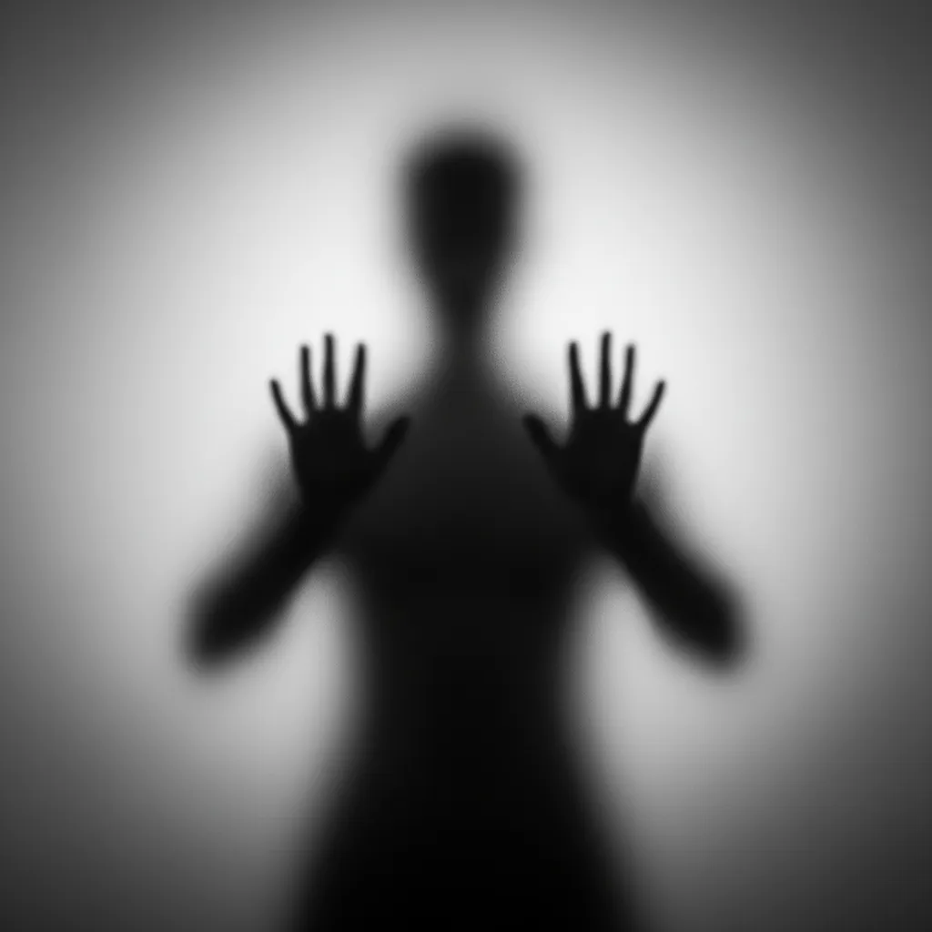 A black and white photograph shows the blurred silhouette of a [SUBJECT] behind a frosted or translucent surface. The [PART] is sharply defined and pressed against the surface, creating a stark contrast with the rest of the hazy, indistinct figure. The background is a soft gradient of gray tones, enhancing the mysterious and artistic atmosphere.