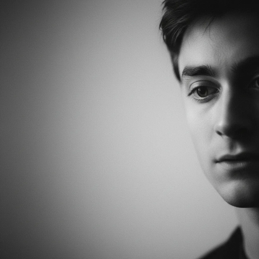 A gentle, directional light, softly diffused, caresses the curve of his cheek or glints in his eye—this is the emotional core of the image. The rest of the composition is dominated by ample negative space, intentionally kept simple, allowing the image to breathe. There are no texts, no logos in the image—only an interplay of light, shadow, and emotion.