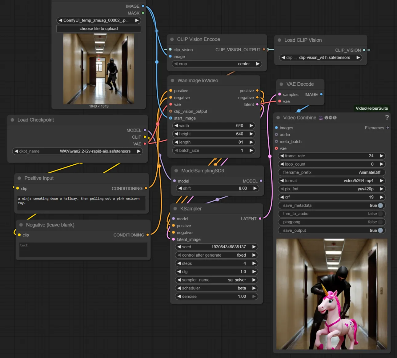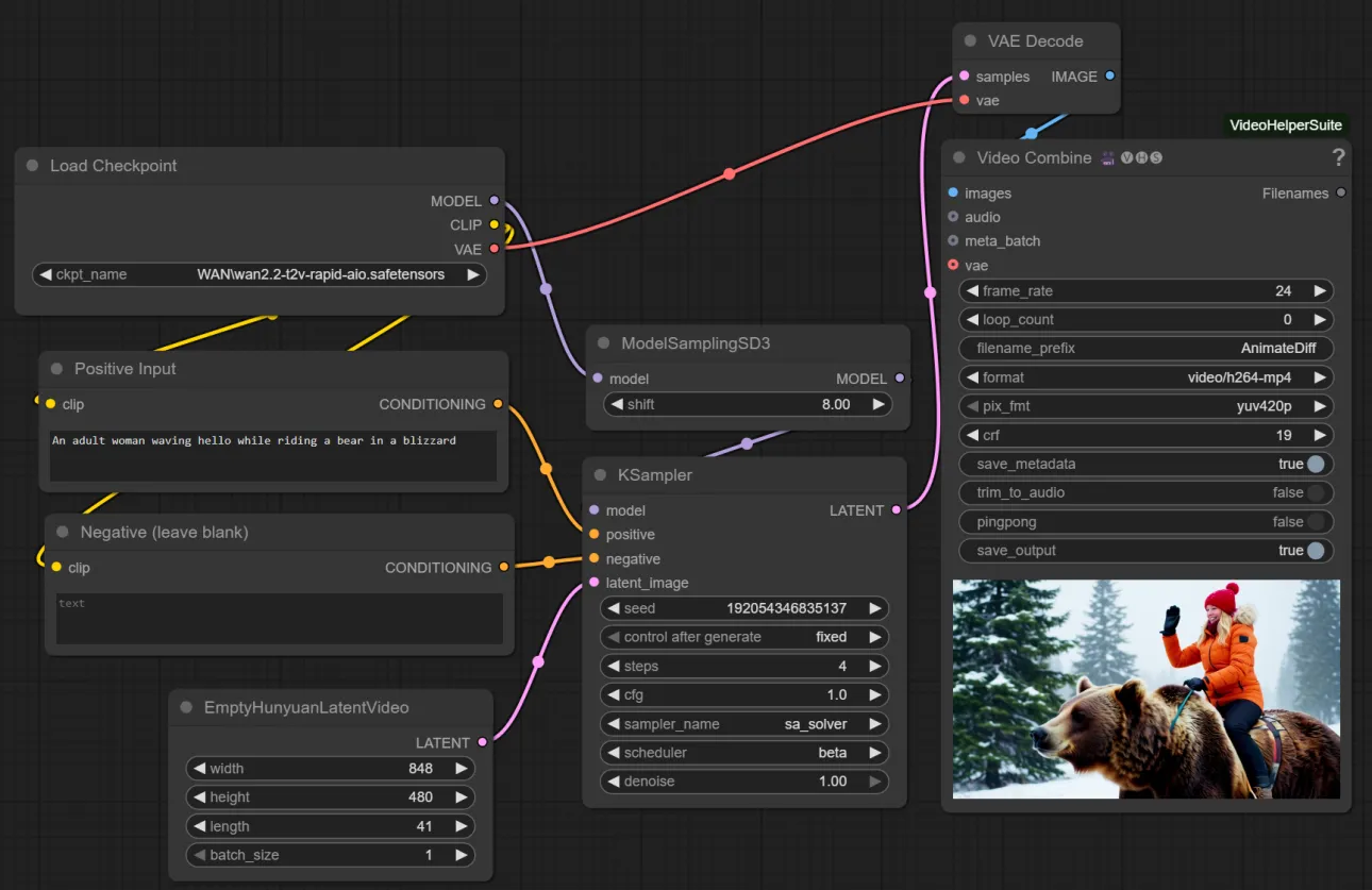 免责声明: 正如您可能预料的那样,为了达到这种速度和简洁性,不得不做出一些妥协。如果您希望进行更复杂的工作流程和更长的生成时间来运行“完整WAN 2.2”的一对模型(这将产生更高品质的结果),或者希望控制此合并中包含的加速器LORAs,有许多其他资源可供选择。
