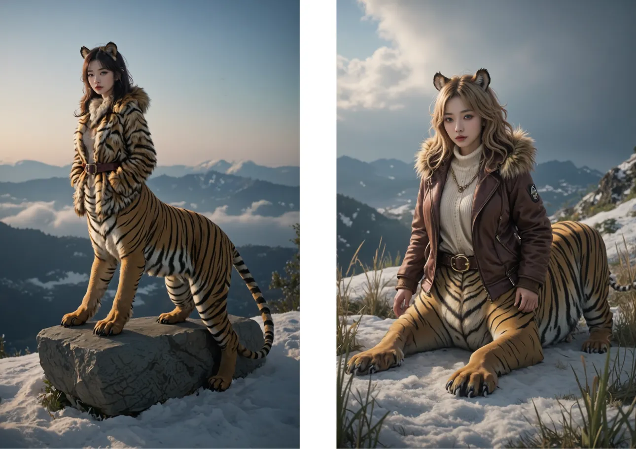 提示词: 老虎女,老虎,站在山顶,风雪覆盖,电影质感