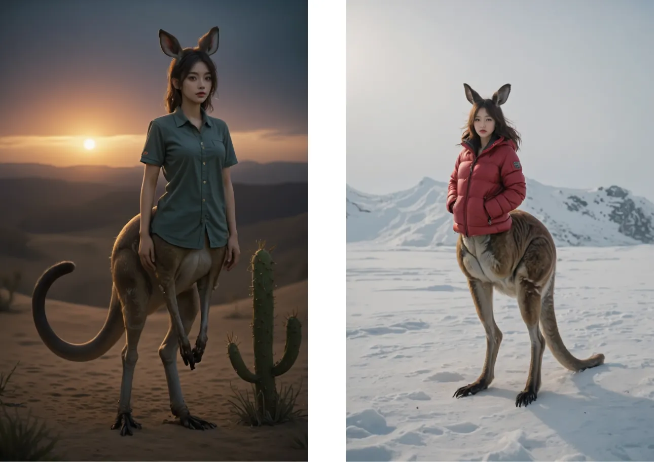 提示词: 袋鼠女,袋鼠,仙人掌,polo衫,电影质感,