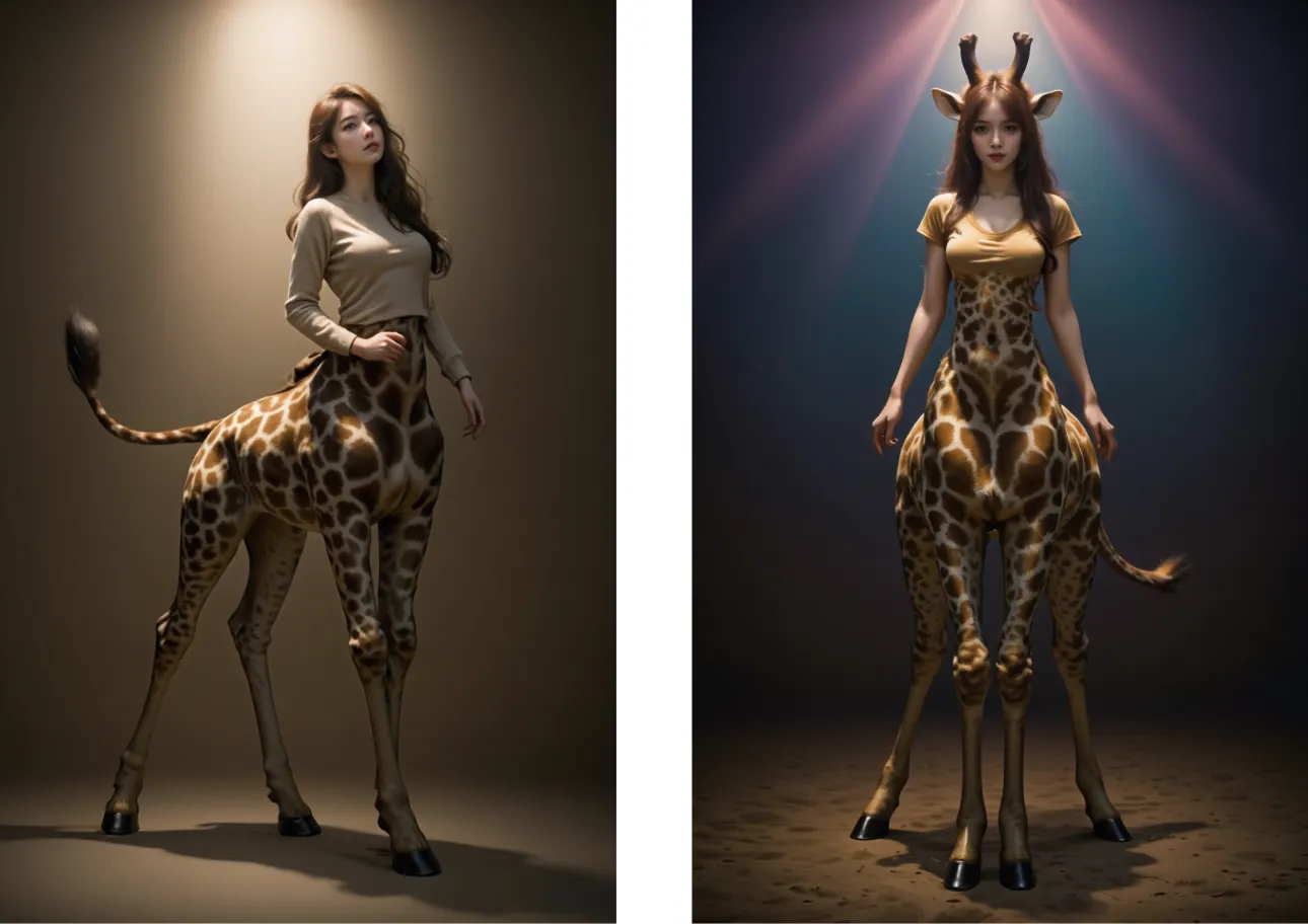 - 长颈鹿修长的腿部与优雅的人类上身搭配,营造出独特的高挑美感。