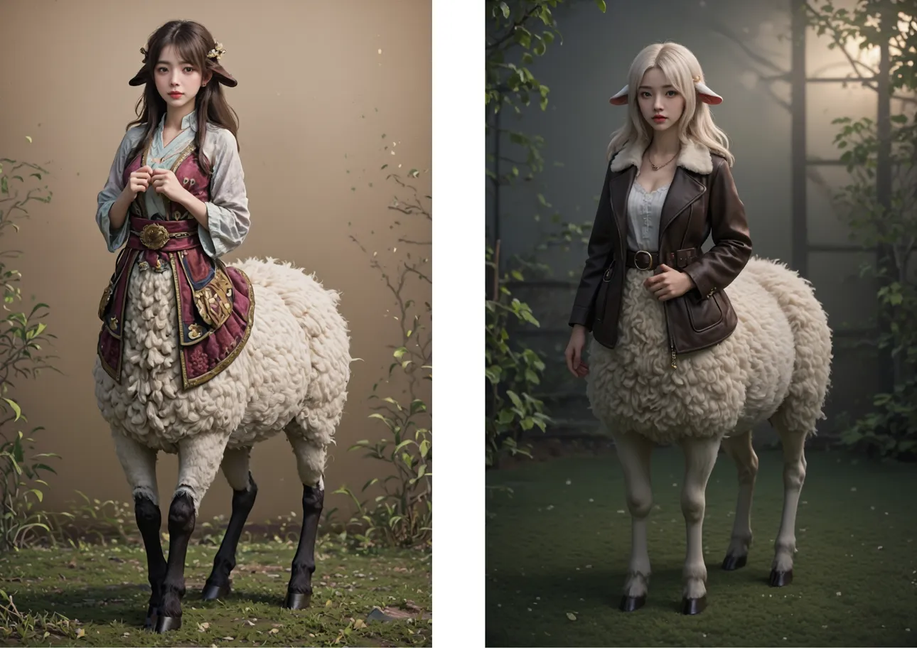 提示词:羊女,羊,电影质感,穿羊皮夹克,姿势,动作,在梦幻花园里玩耍,