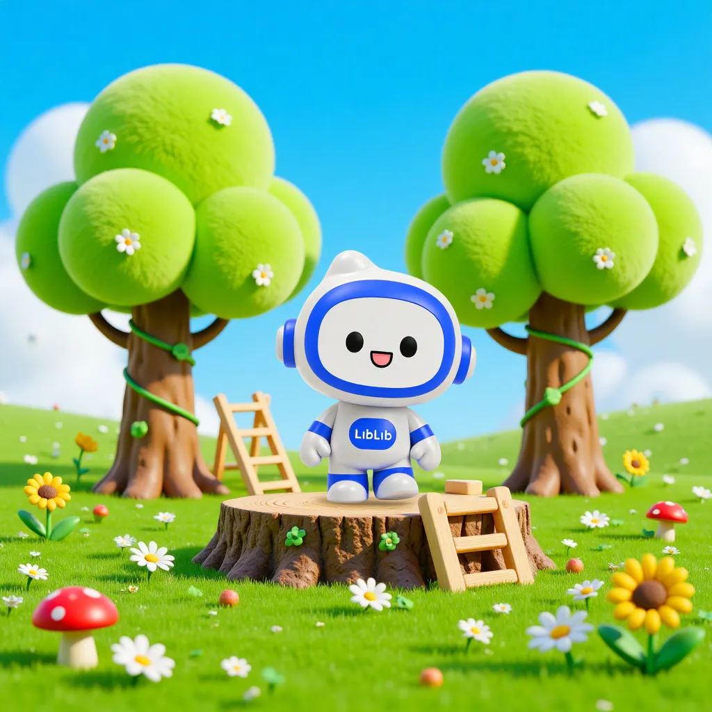 A CGI image of a cute,white and blue robot with a smiling face. The robot has a blue "LibLib" logo on its chest. The background is a bright, sunlit meadow with two large, cartoonish trees adorned with white flowers. A wooden ladder leans against a tree stump in the center, surrounded by colorful mushrooms and daisies. The sky is a clear blue with fluffy clouds.