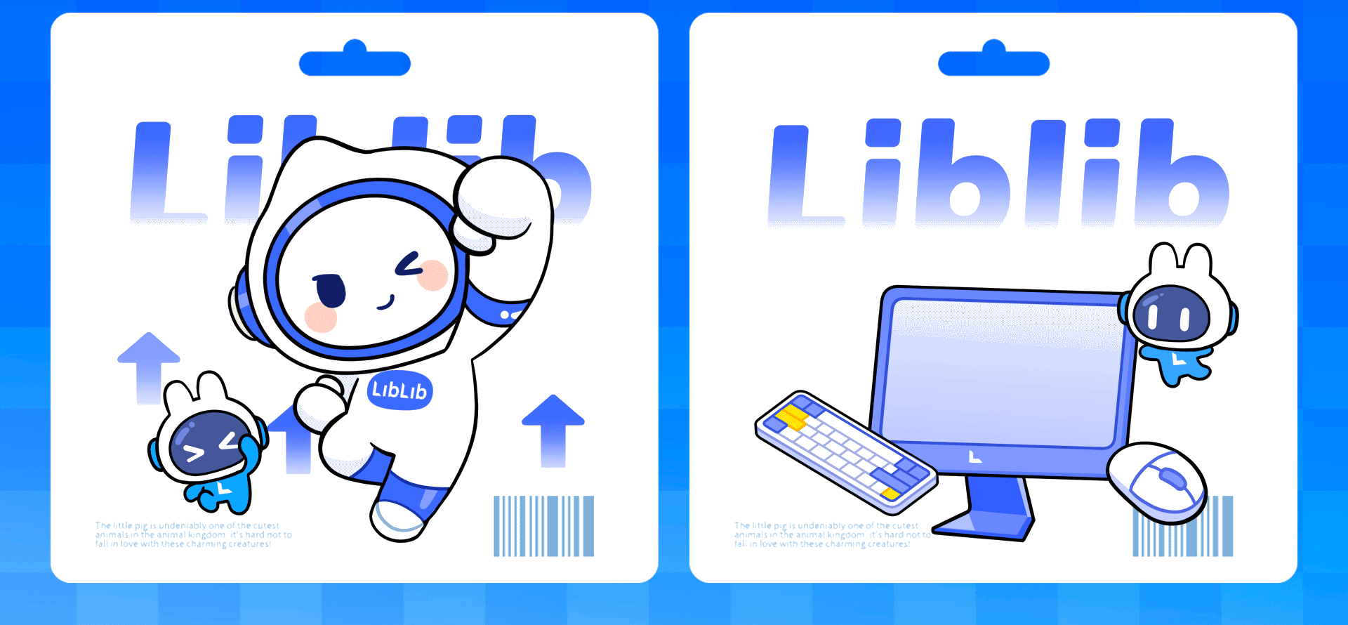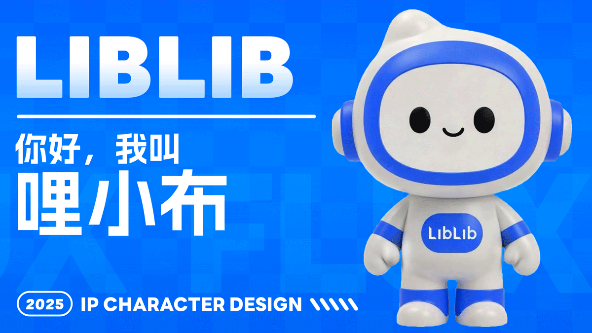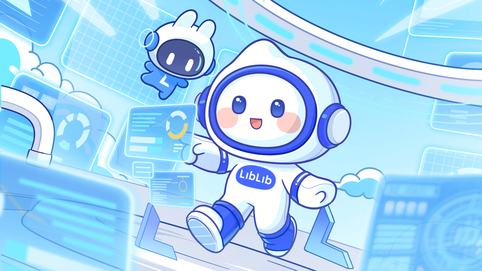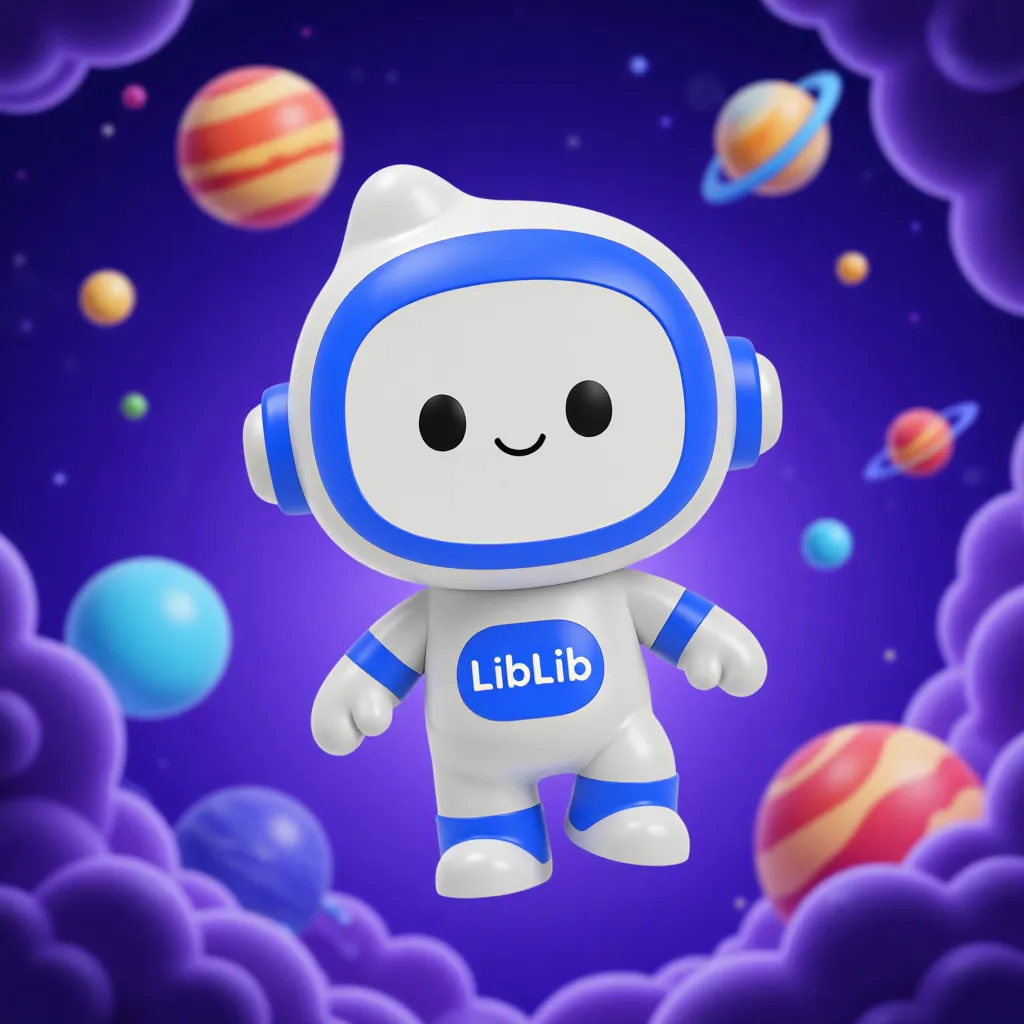 A CGI image of a cute, white, blue-accented robot with a smiling face and a "LibLib" logo on its chest, standing on a glowing blue platform in a futuristic, high-tech room with hexagonal panels and neon blue lighting. The robot has a rounded, friendly design with large, expressive eyes and a small, round head.