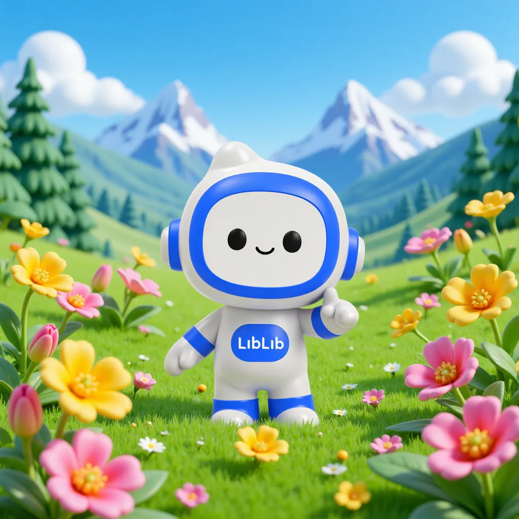 A CGI image featuring a cute,white robot with blue accents and a smiling face,standing in a vibrant,colorful meadow filled with blooming flowers and lush greenery. The background showcases a serene mountain landscape under a bright blue sky with fluffy clouds. The robot,labeled "LibLib," has a friendly,childlike appearance.,