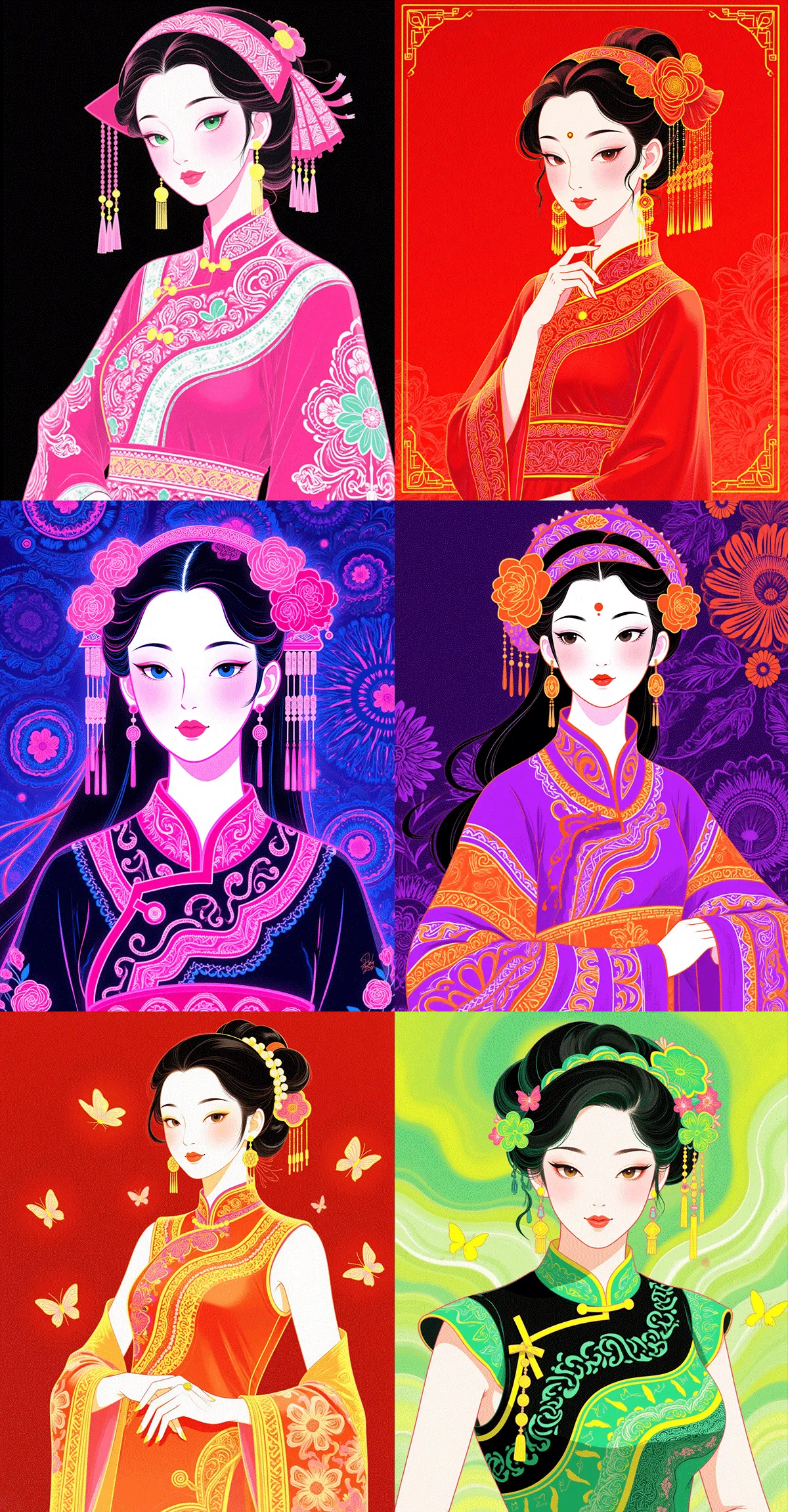 ethnic customs, This is a digital illustration of a serene Asian woman with fair skin and dark hair styled in an elegant updo, adorned with a green headpiece. She wears a traditional black and green cheongsam with intricate patterns. The background features swirling green and yellow hues with butterflies, creating a dreamy, ethereal atmosphere